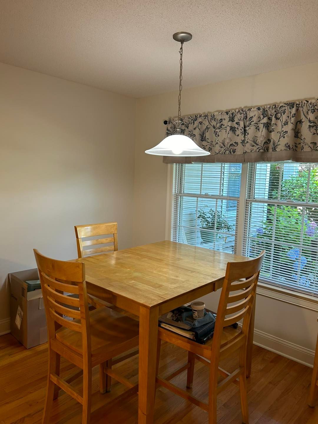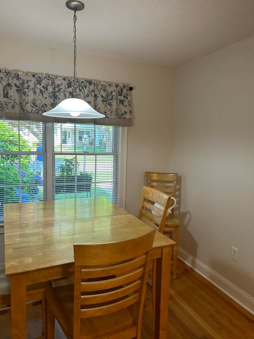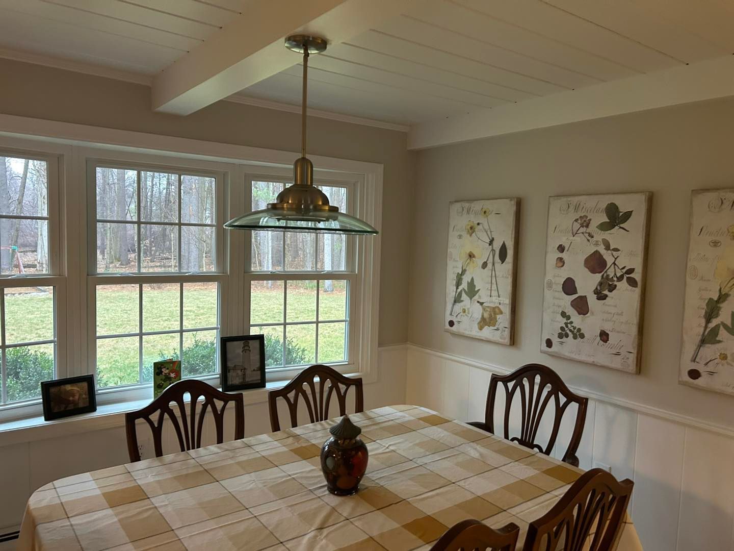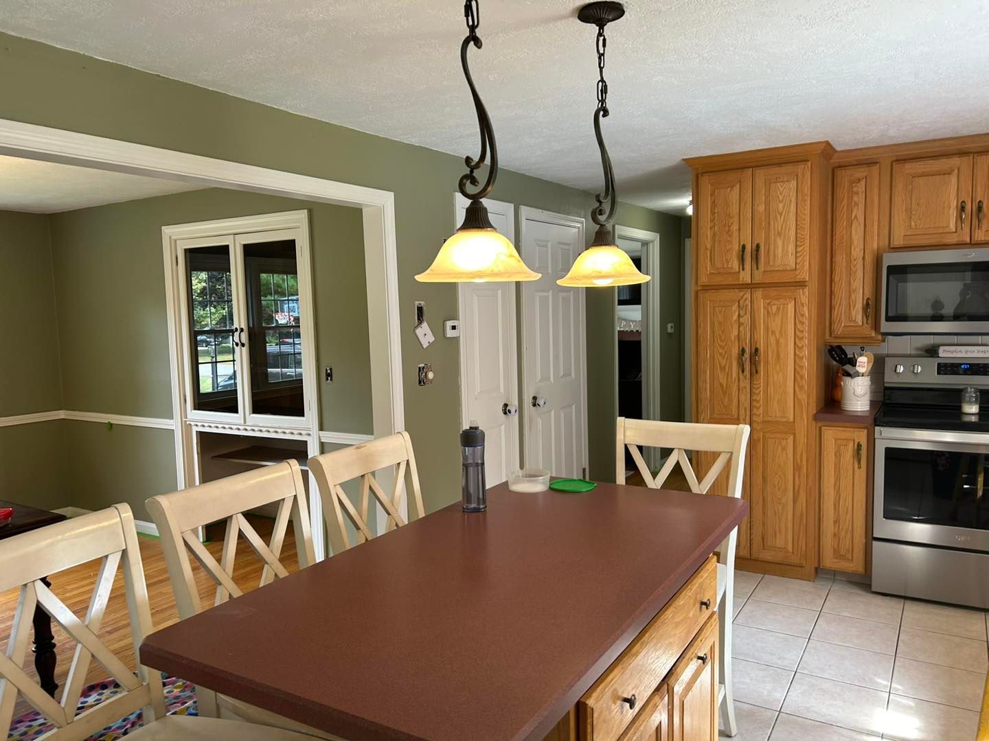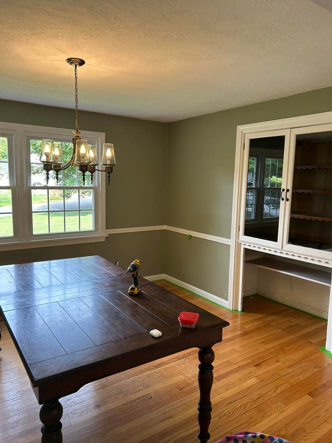 Finally, the dining room was given a coat of primer before putting two coats of paint on the ceiling. After that the walls were given two coats of color matched Milkweed Pod with a satin finish.