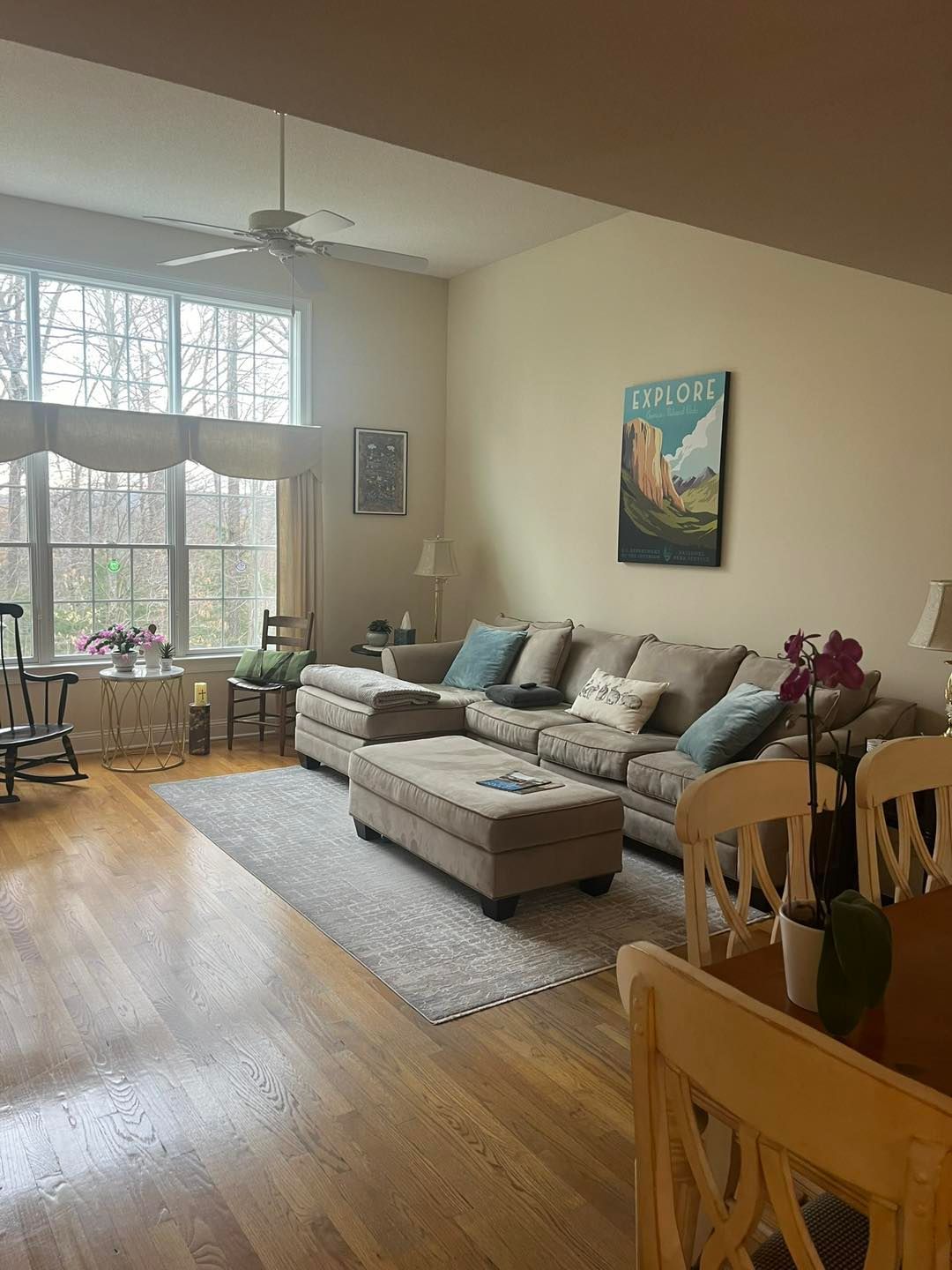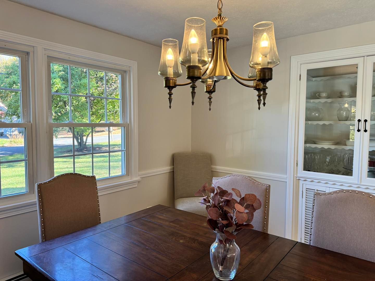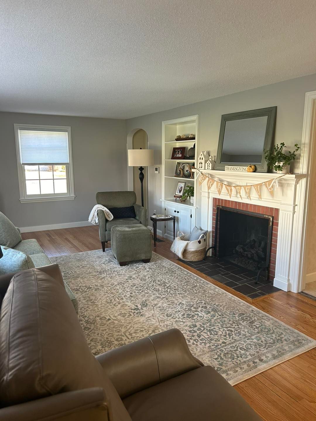 We transformed their living room from a shade of brown to color matched Agreeable Grey (eggshell sheen). All trim and baseboard were sanded, primed and painted with 2-3 coats of basic white semigloss.