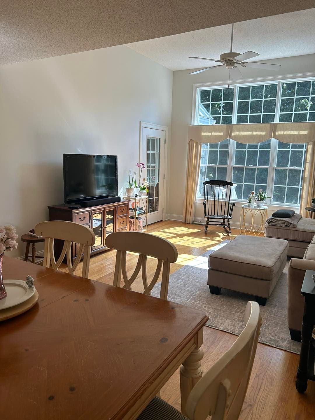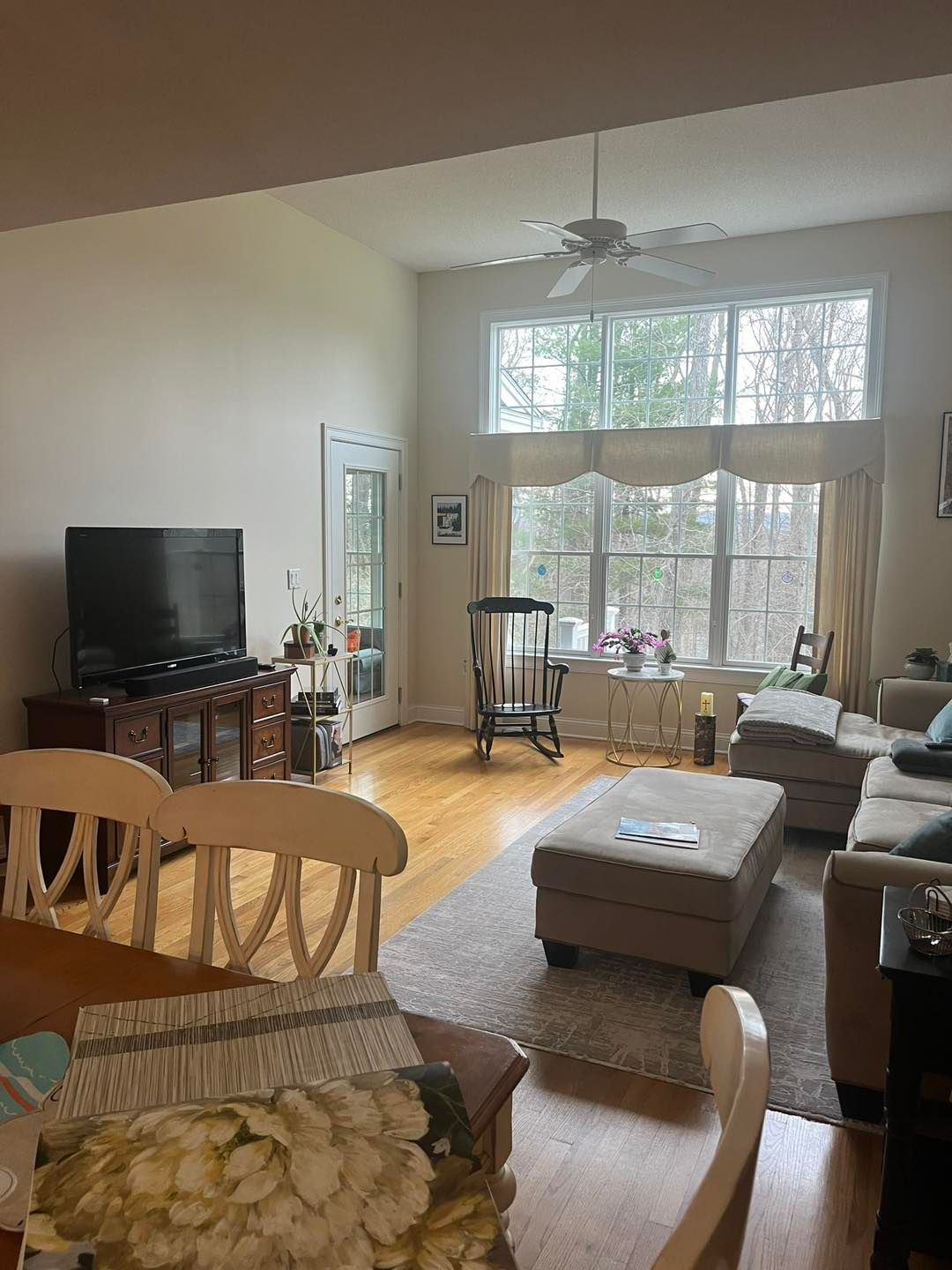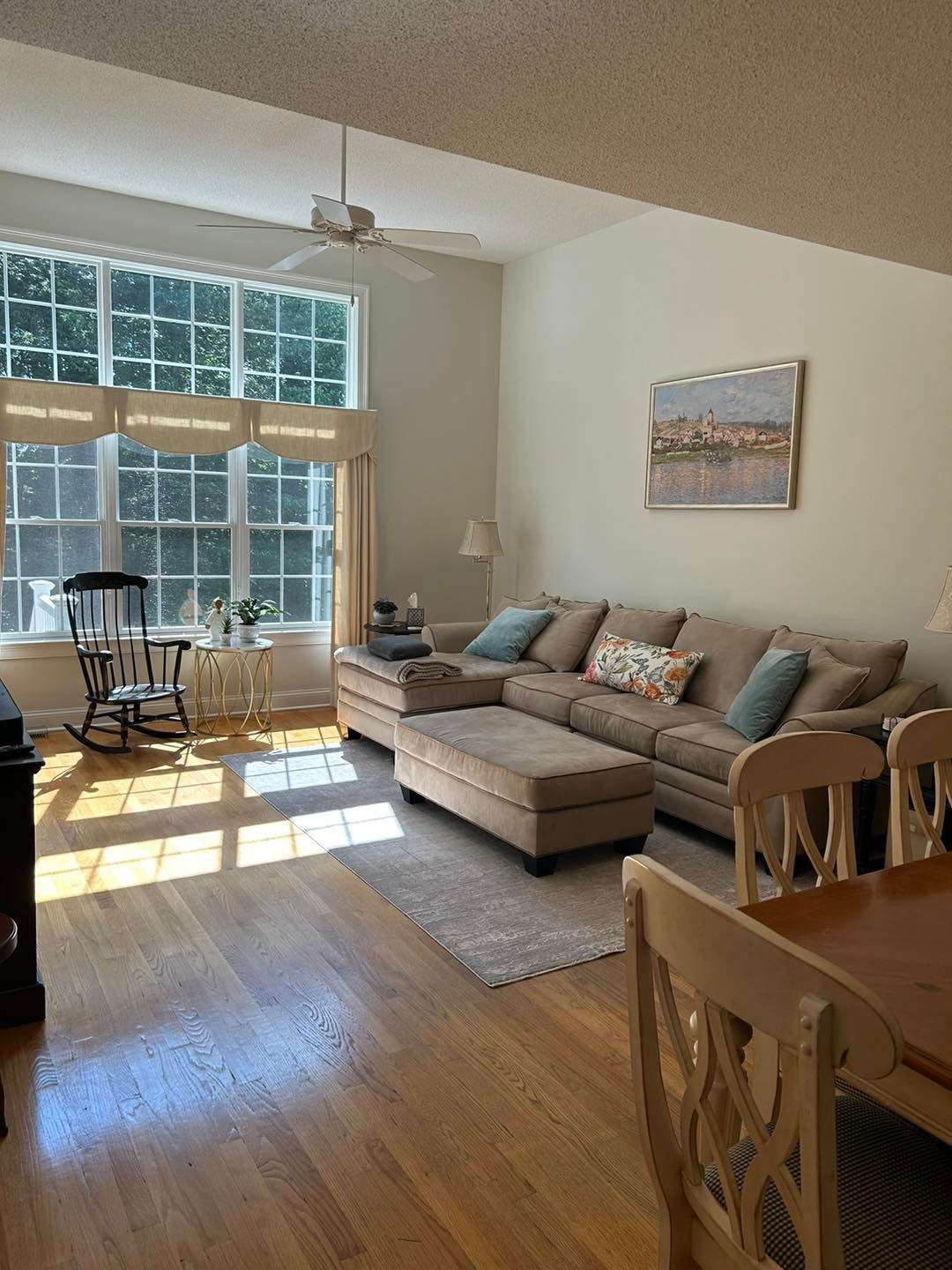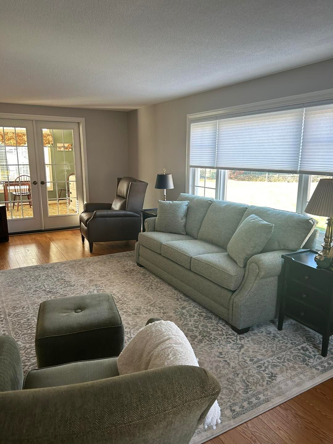 We transformed their living room from a shade of brown to color matched Agreeable Grey (eggshell sheen). All trim and baseboard were sanded, primed and painted with 2-3 coats of basic white semigloss.
