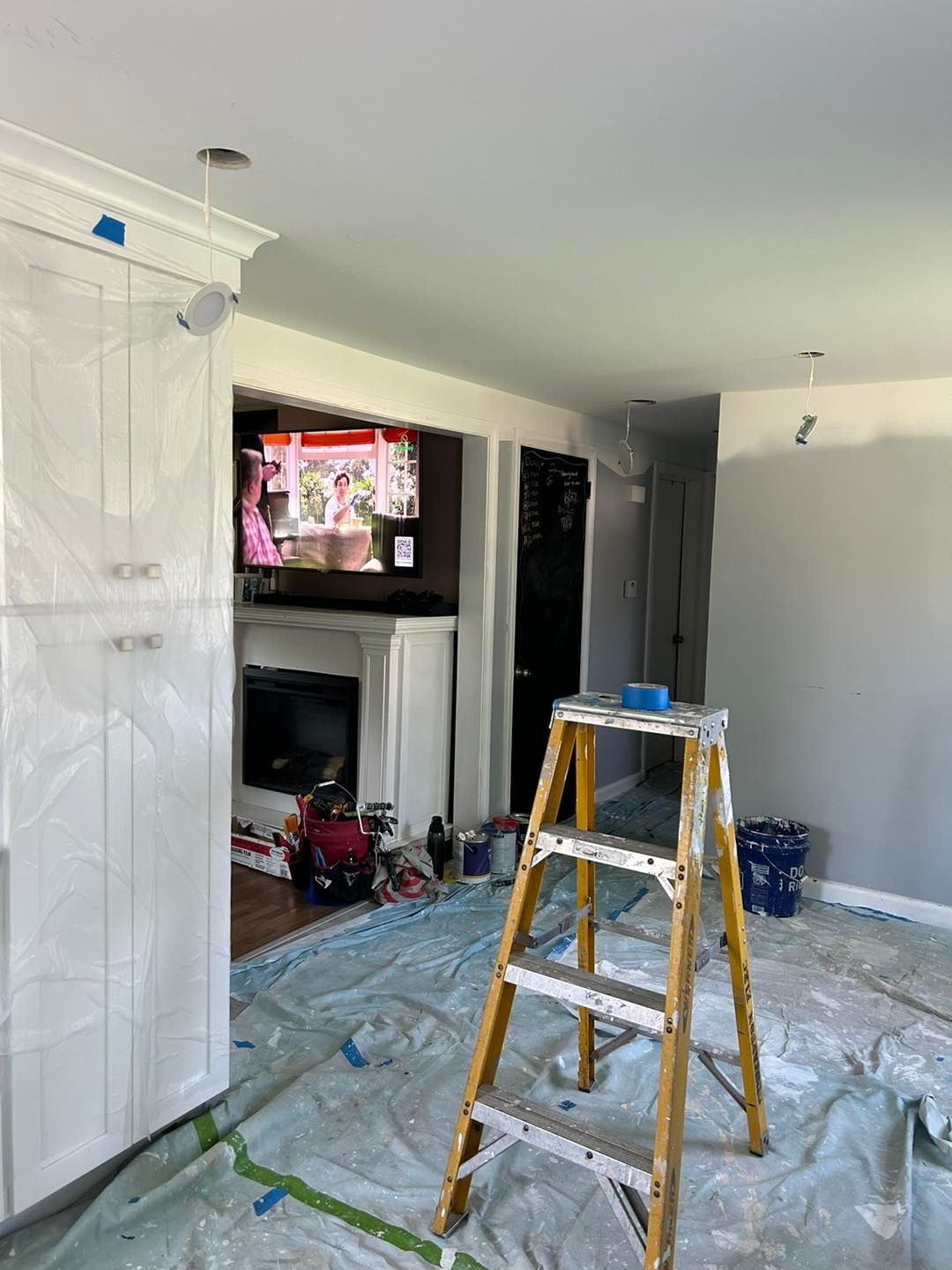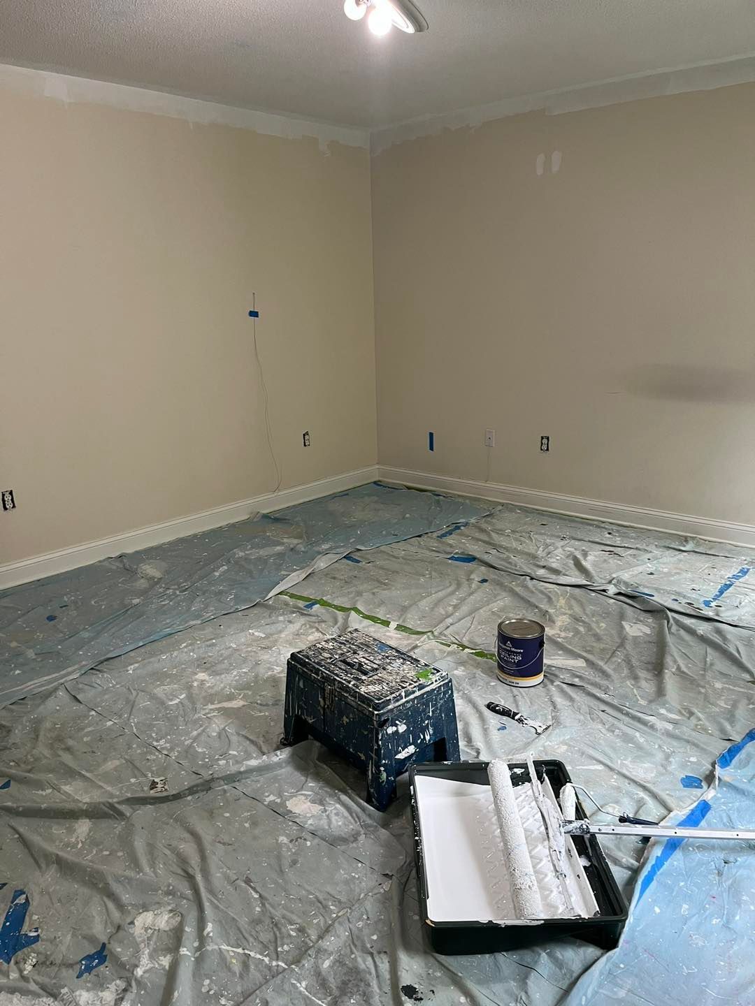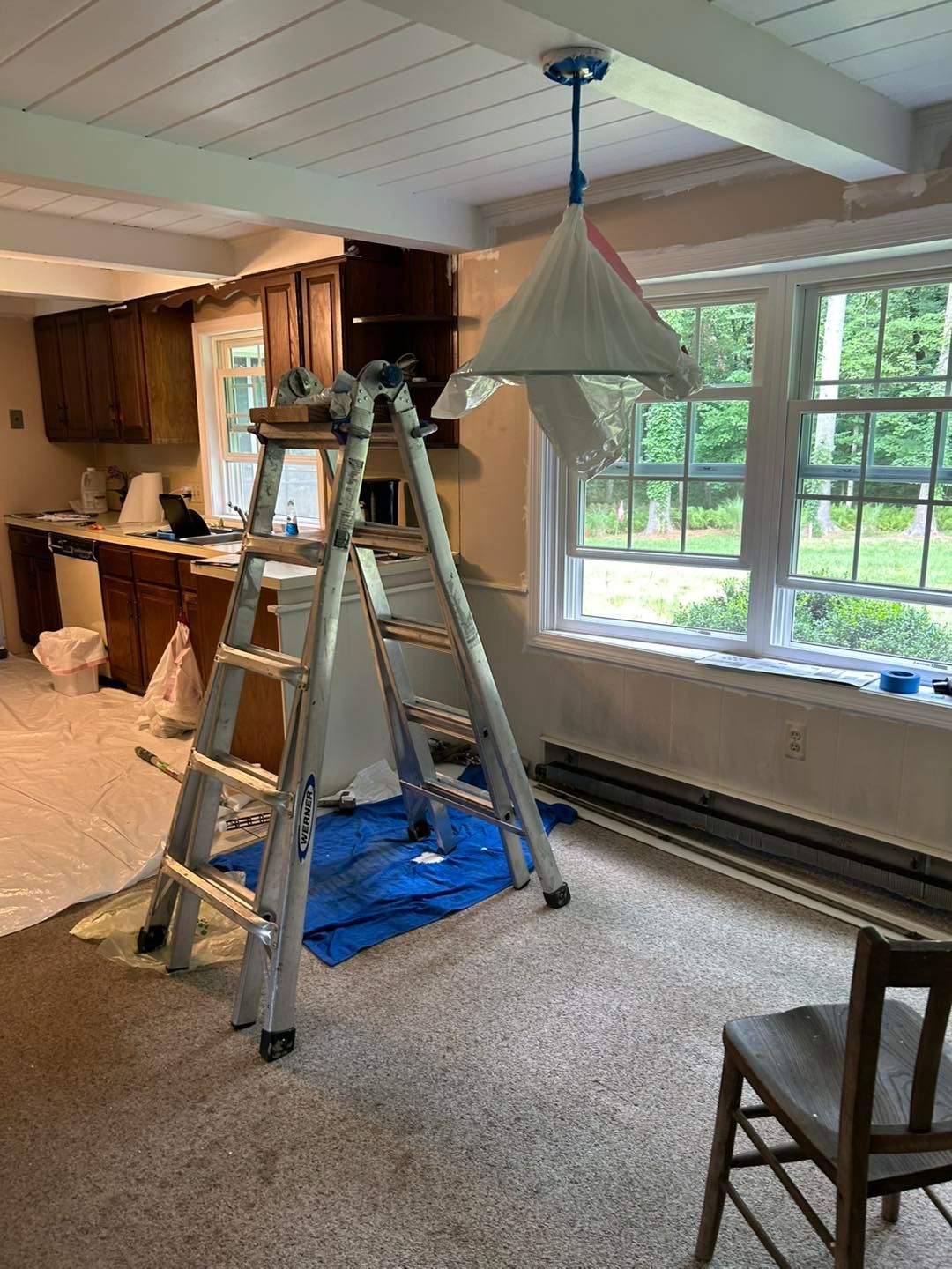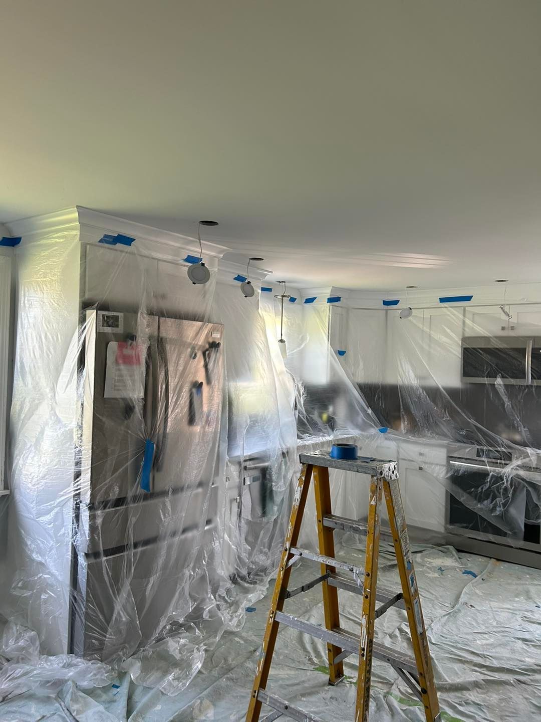 We started by covering all her cabinets and appliances with plastic. Then covering the floor with drop cloths to prevent drips.