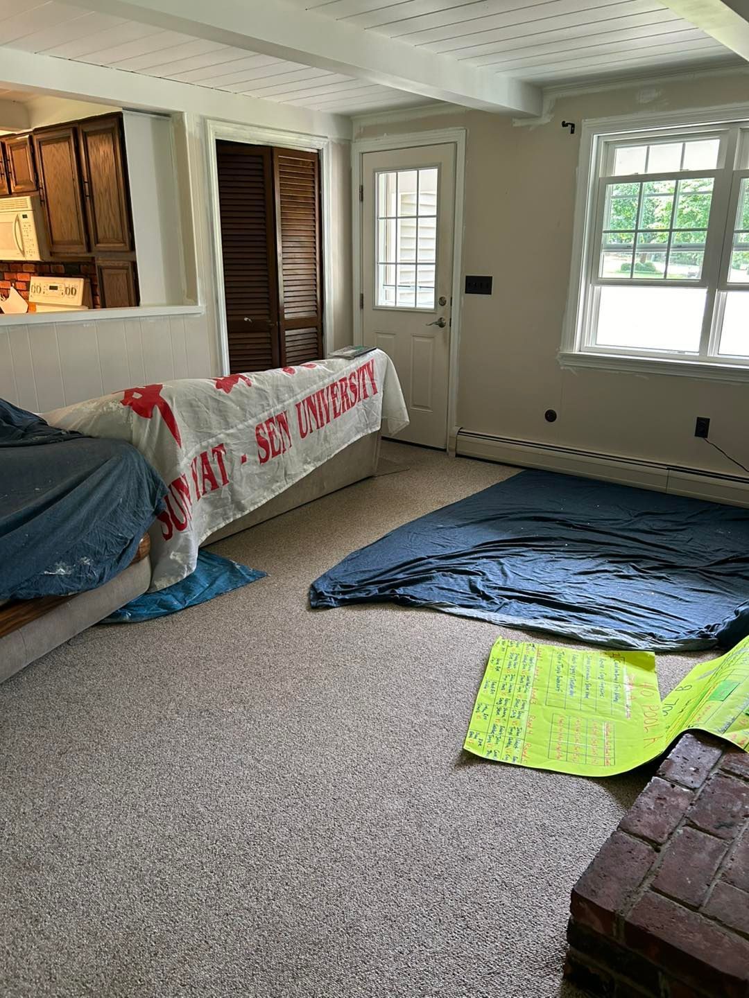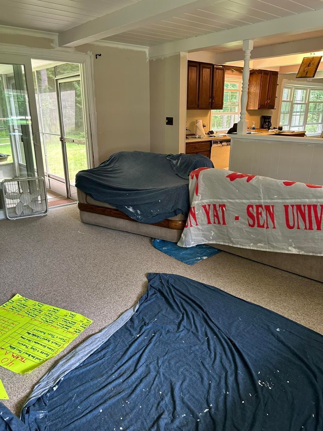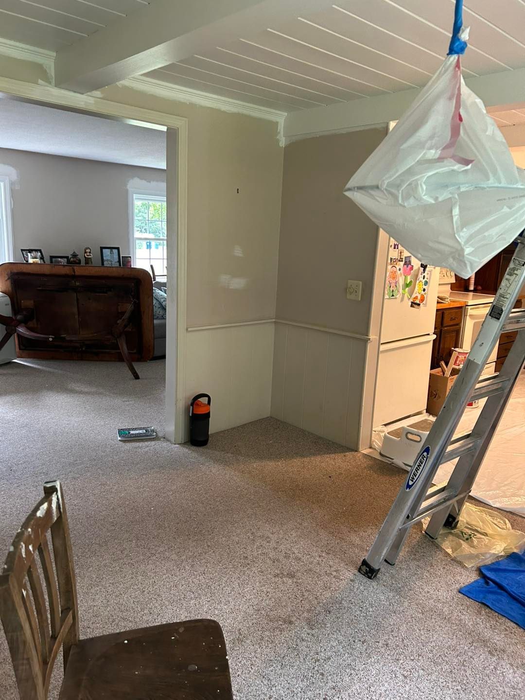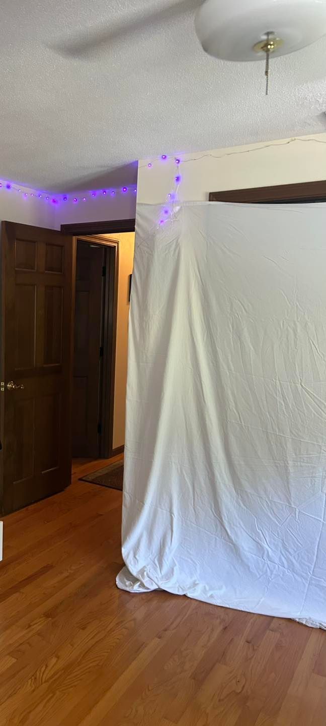 We started by covering all her cabinets and appliances with plastic. Then covering the floor with drop cloths to prevent drips.