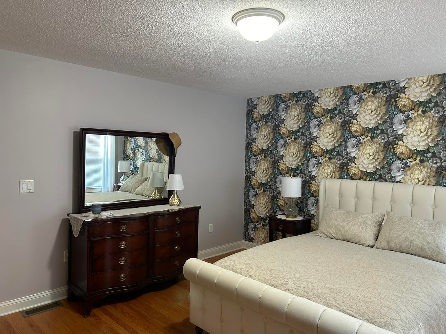 First, we started in the bedroom where we applied to coats of Ben Moore's waterborne ceiling paint. The trim, baseboard, both side of the closet and bedroom door were all given two coats of Ben Moore's White Dove with a semigloss finish. Three of the walls were painted Ben Moore Wood Ash with an eggshell finish. The accent wall wallpaper was applied by Jennifer Powell.
