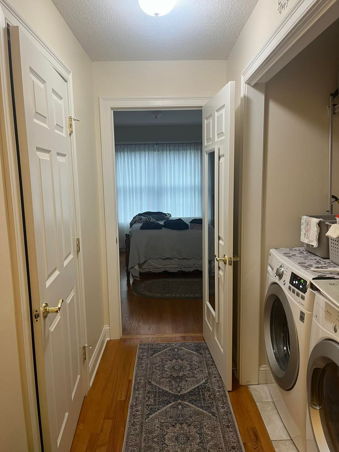 Up first was the front door, foyer/hallway and the bathroom hallway. All of which were primed first. The trim, doors and baseboard were given two coats of Ben Moore’s Stock White with a semigloss finish. All walls were given two coats of Swiss Coffee with an eggshell sheen.