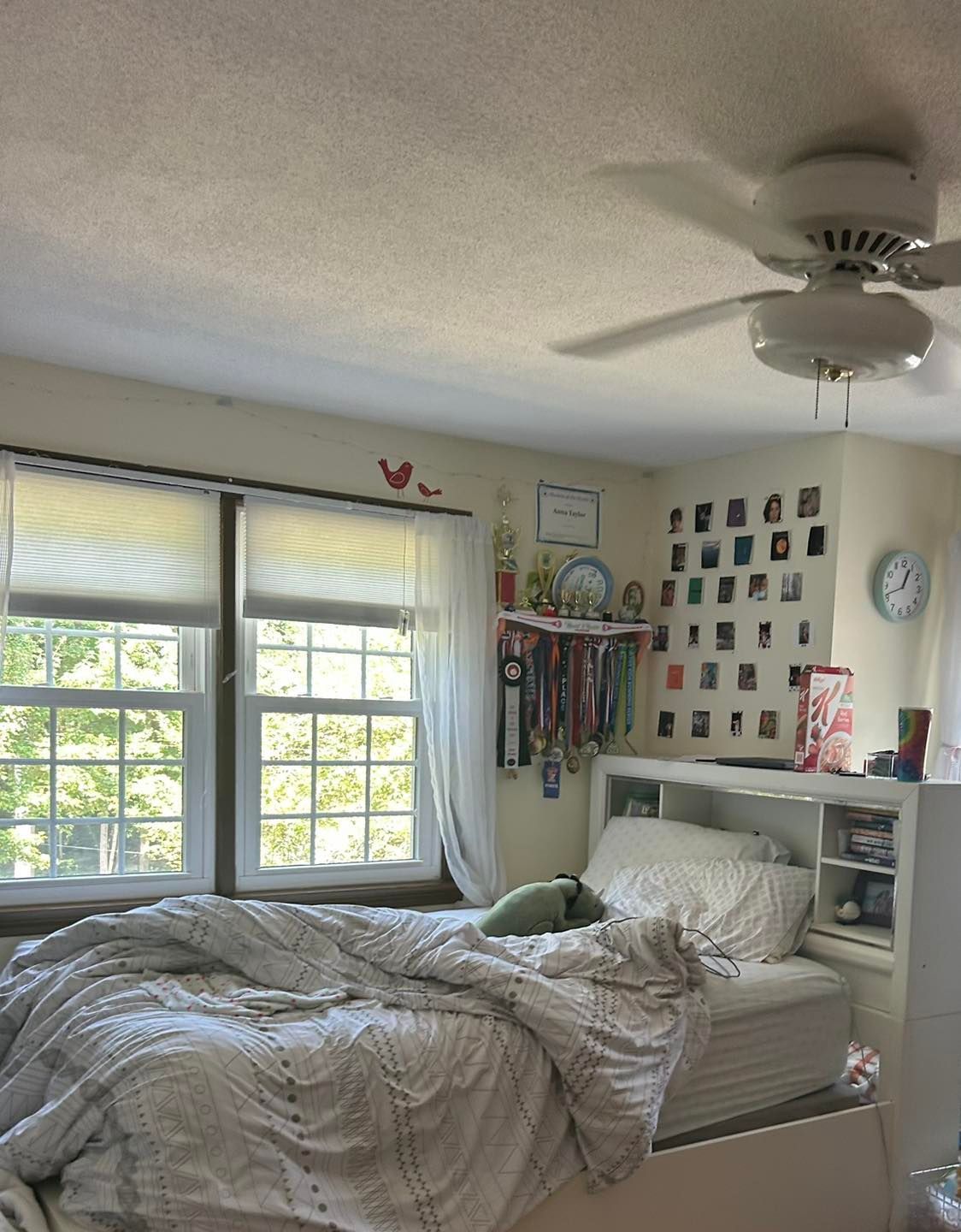 First the bedroom walls were primed with Ben Moore’s Fresh Start primer. Next, the ceiling was given two coats of Ben Moore’s waterborne ceiling paint. With the prep and ceiling out of the way, the walls were given two coats of (color matched) Pussywillow with an eggshell sheen.