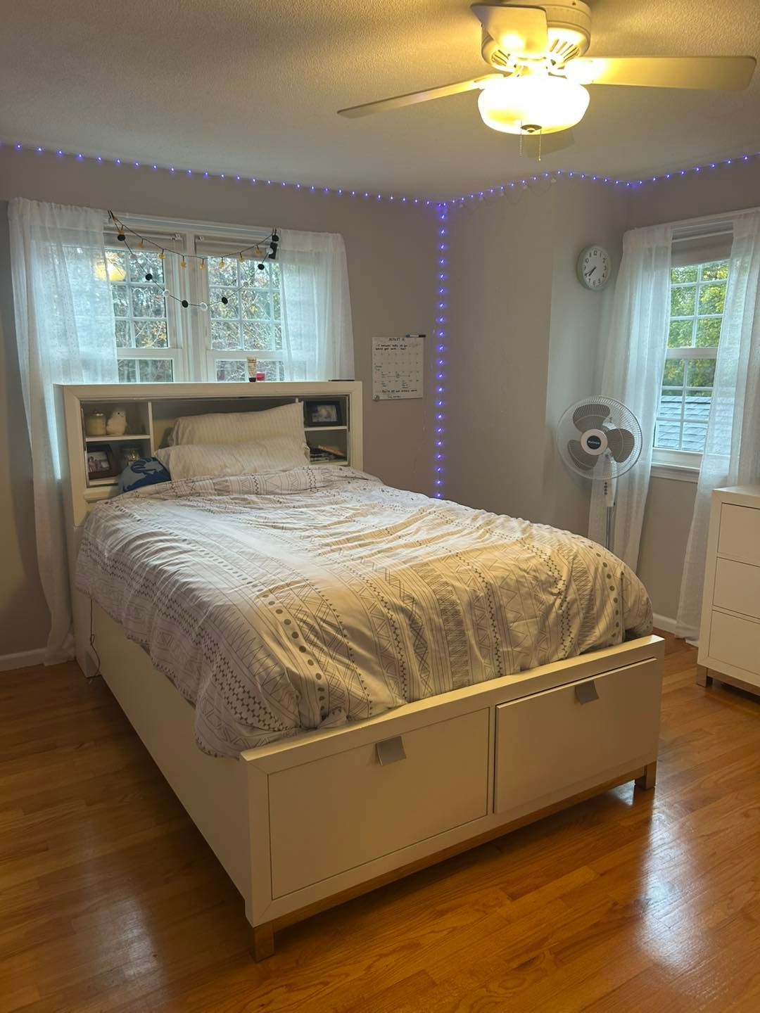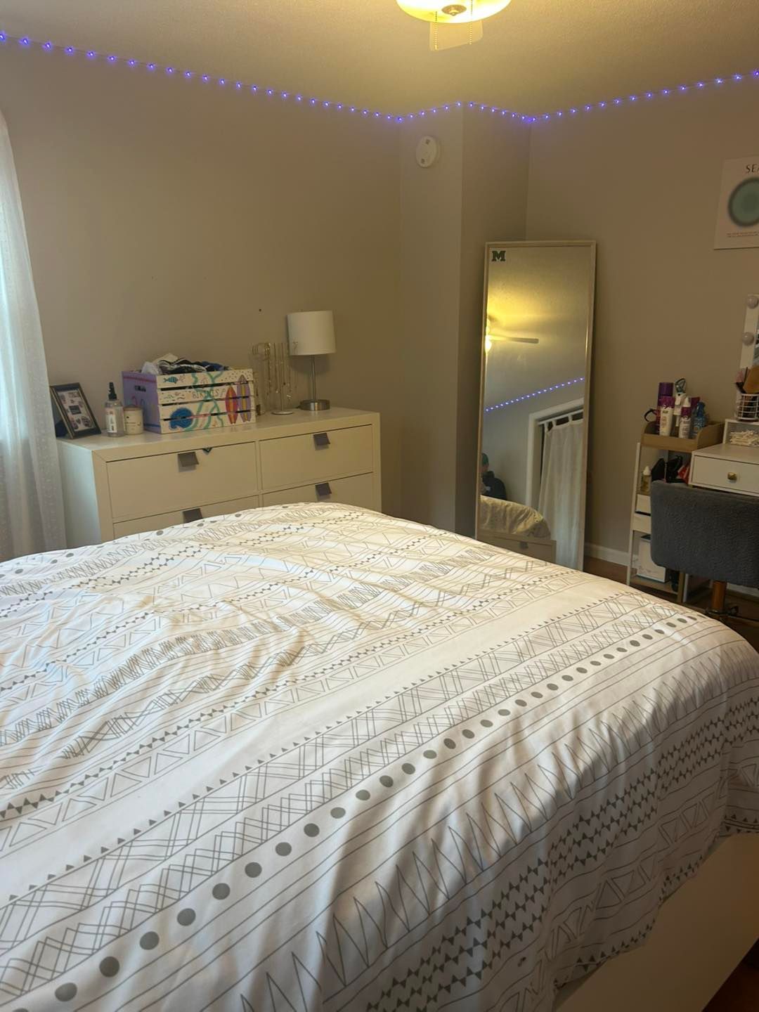 First the bedroom floors were covered with tarps and any furniture was given a new coat of plastic to protect it. Then the walls were painted twice with Ben Moore’s Gentleman’s Grey with a matte finish.
