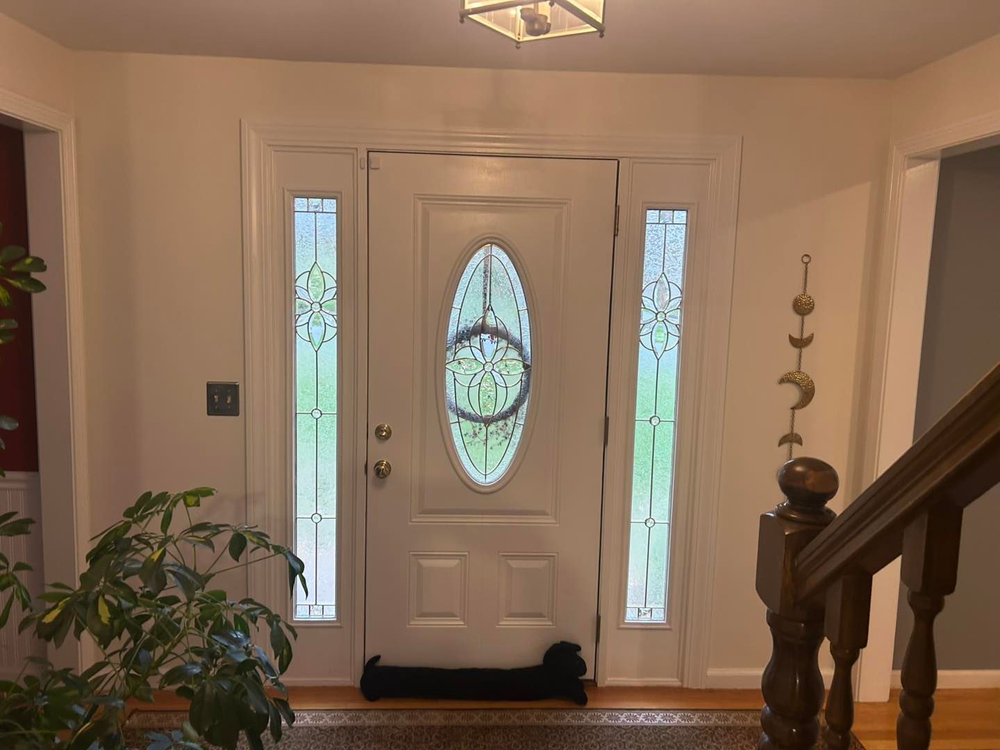 After that all trim, baseboard and the entrance door were primed with Insl-x primer. After that they were given two coats of Benjamin Moore Chantilly Lace with a semigloss finish.