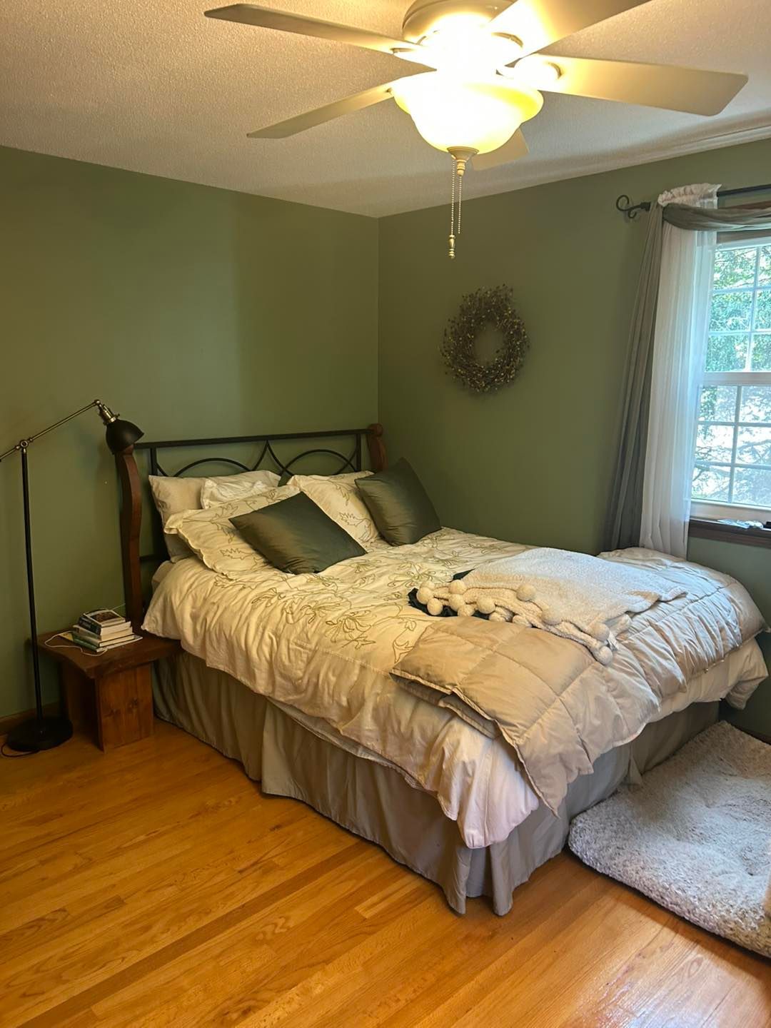 The trim and baseboard were given two coats of White Dove with a semigloss finish. The walls were painted Budding Green with an eggshell finish.