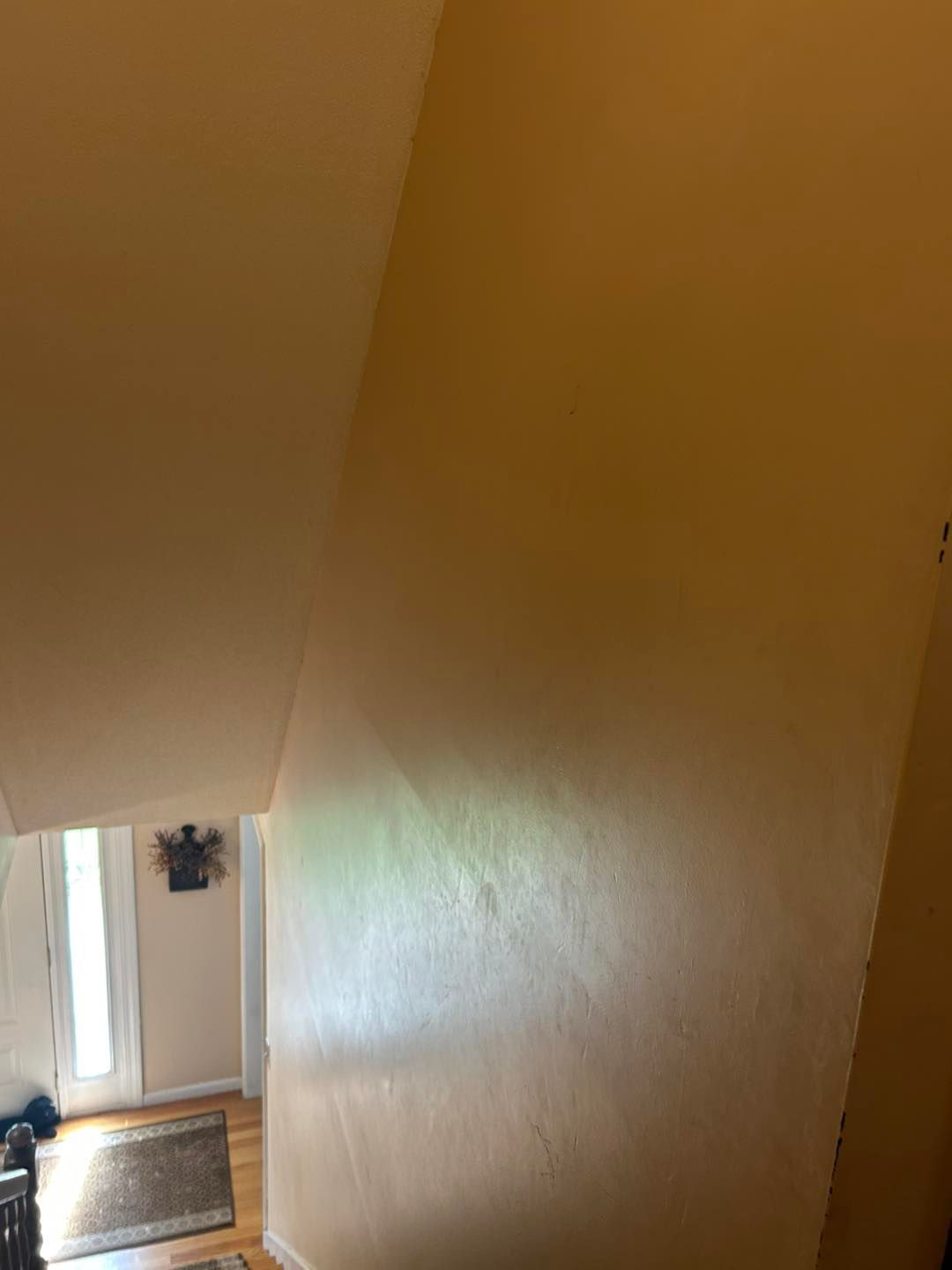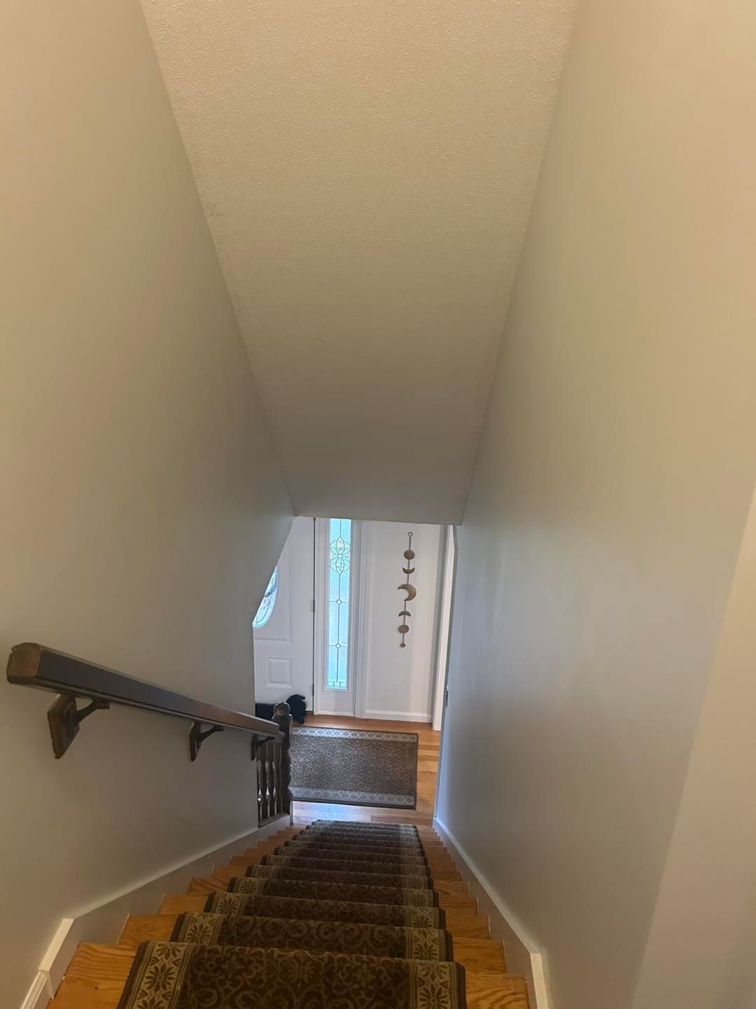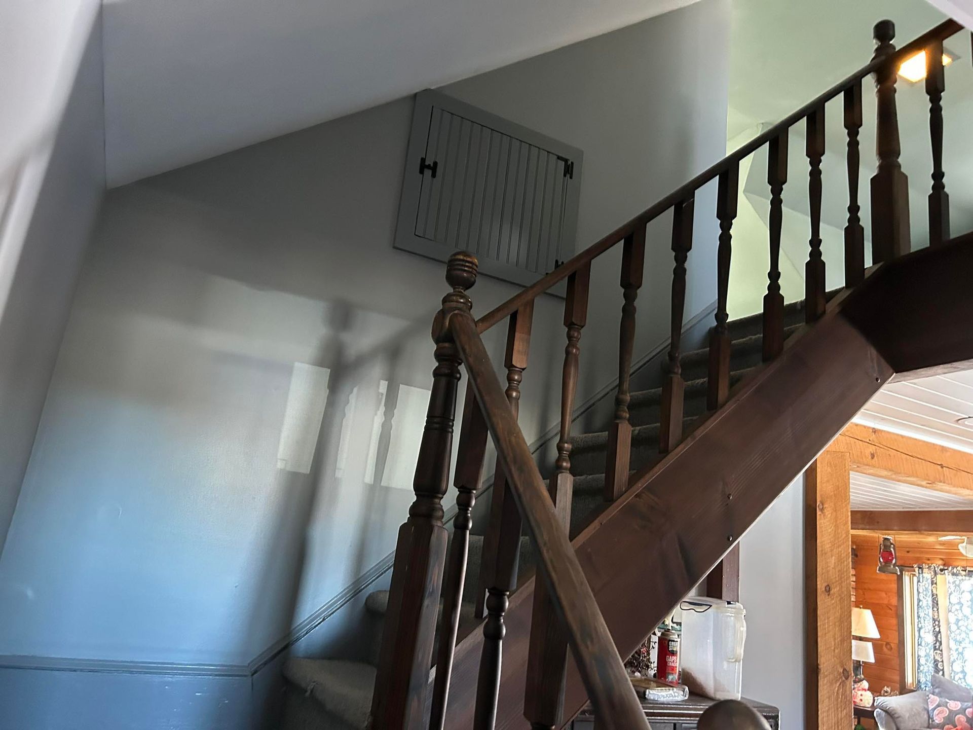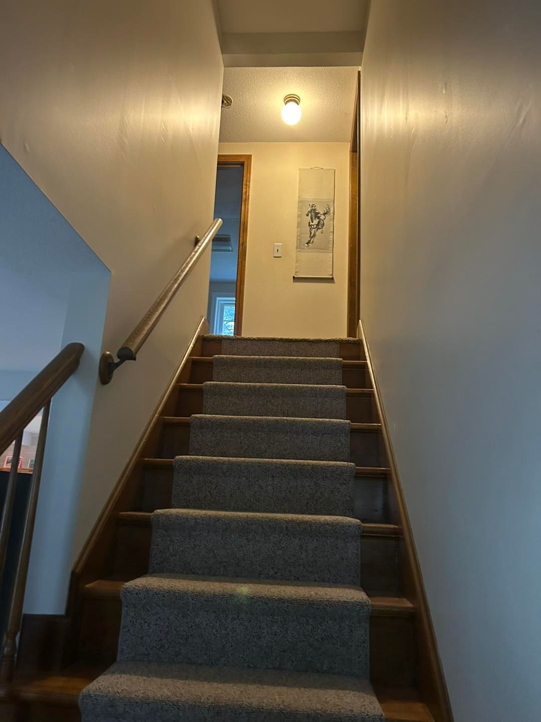 The stairwell was given a new coat of ceiling paint. The stairs and railing were freshened up with 2 new coats of stain as well as several coats of polyurethane to protect it.