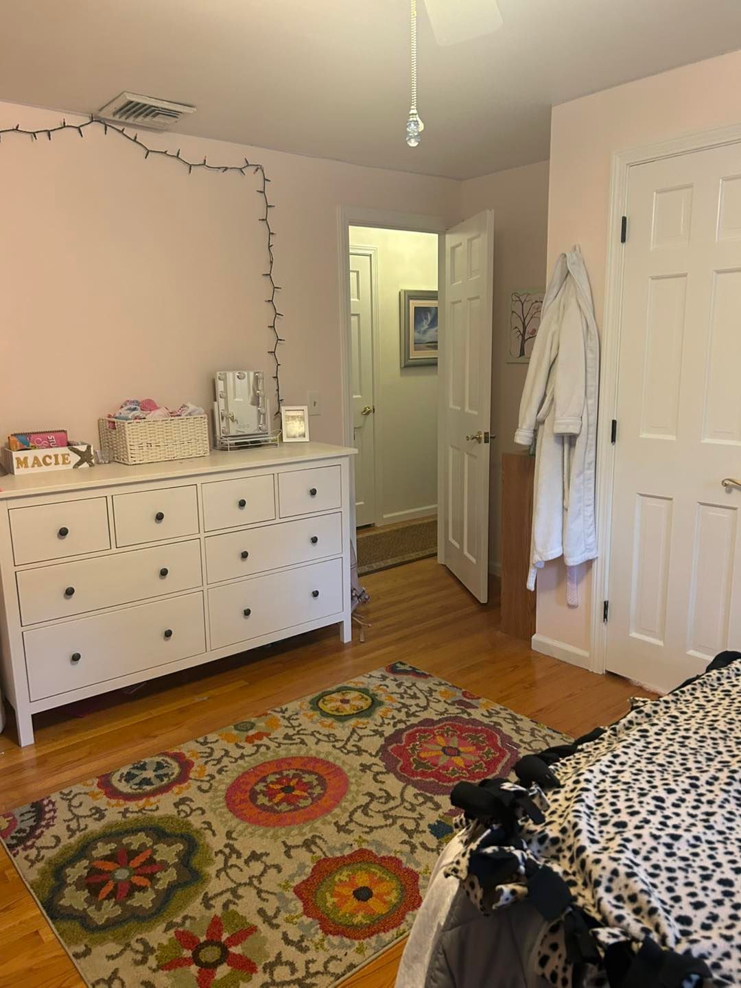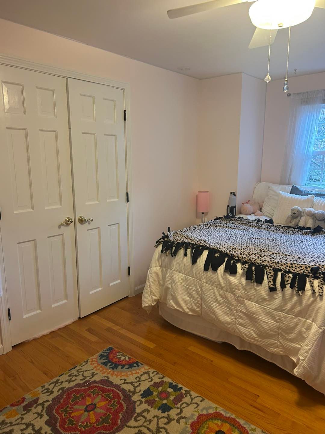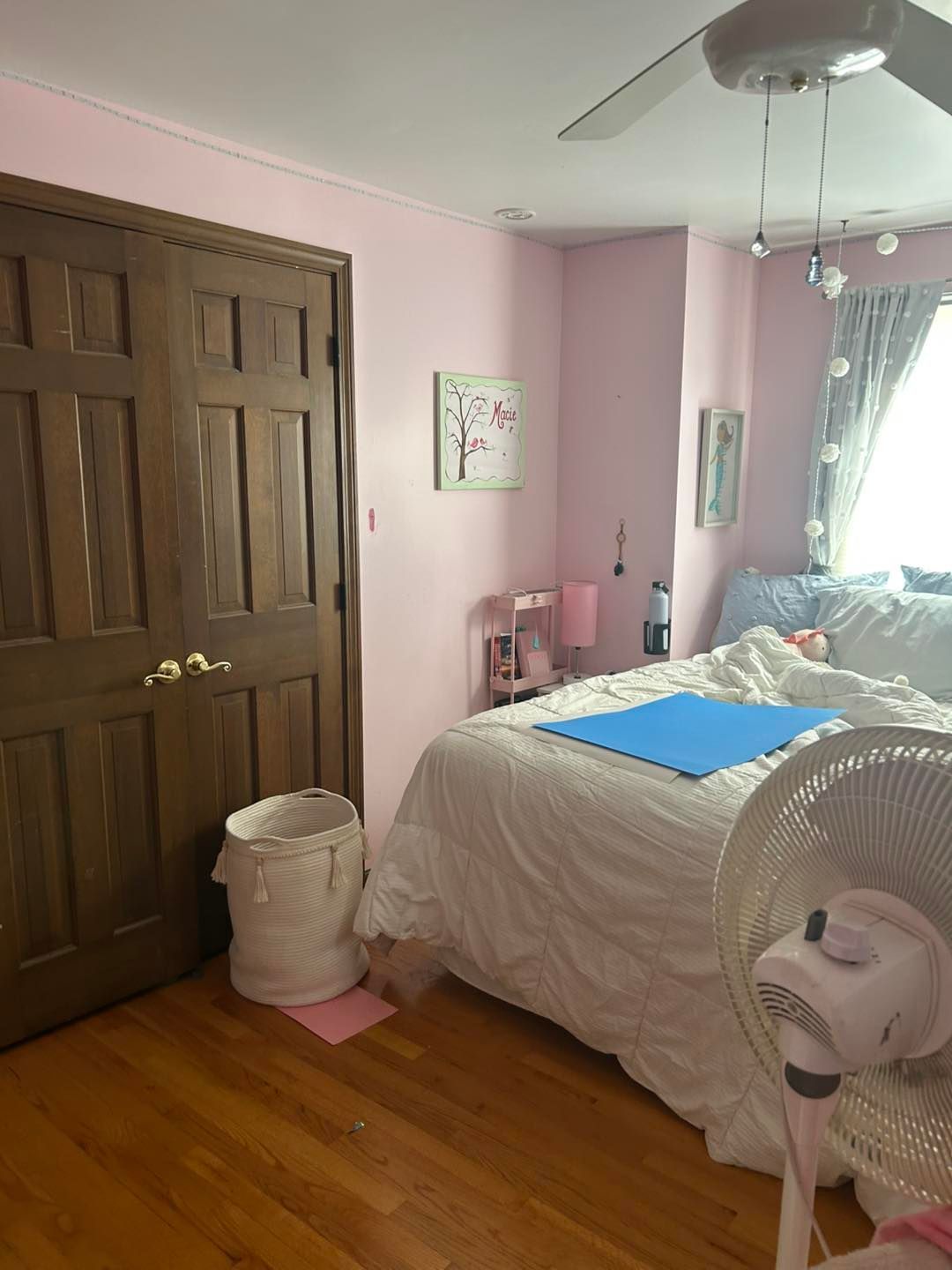 The first bedroom’s woodwork was treated the same. Sanded, prime twice and painted two to three times. The walls were primed, and its look was completed with two coats of Mellow Pink with an eggshell finish.