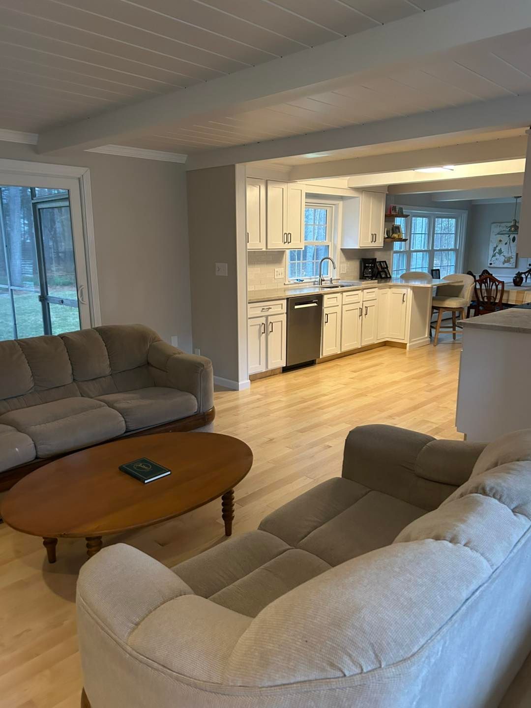 He needed a new look to his family room, dining room, hallway, office, family room and stairs.