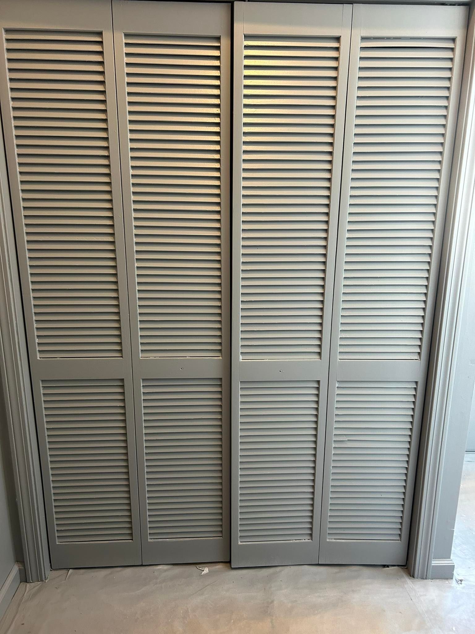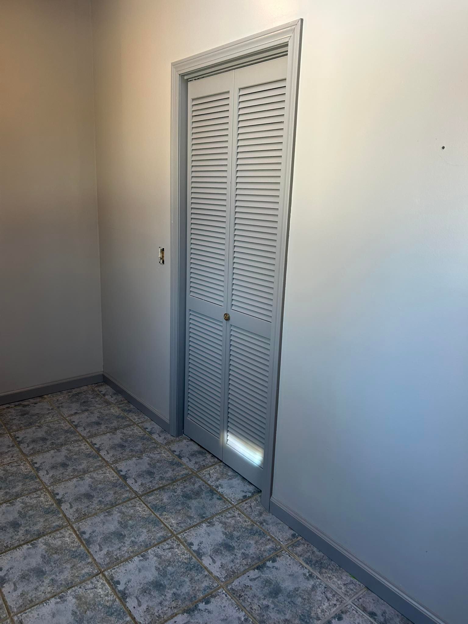 Finally, we moved on to the den. Both the closet and entrance door, as well as all the trim and baseboard were given two coats of Ben Moore's Chantilly Lace (semigloss sheen). Once the trim was finished, the walls were given two coats of the Grey Screen with an eggshell finish.