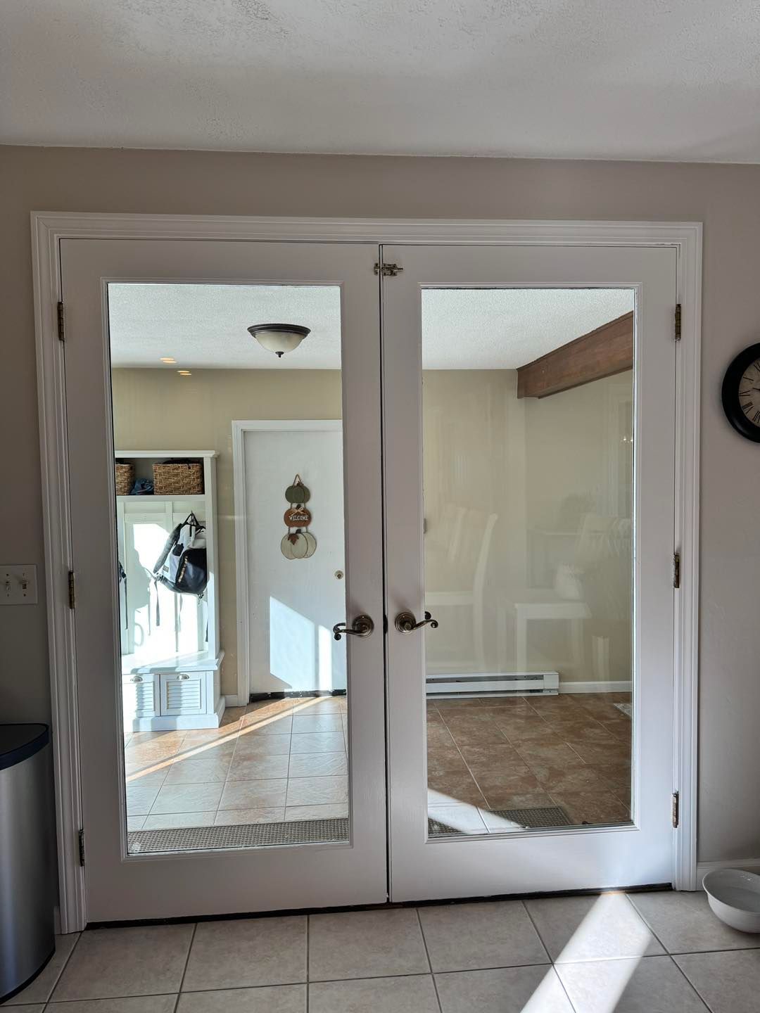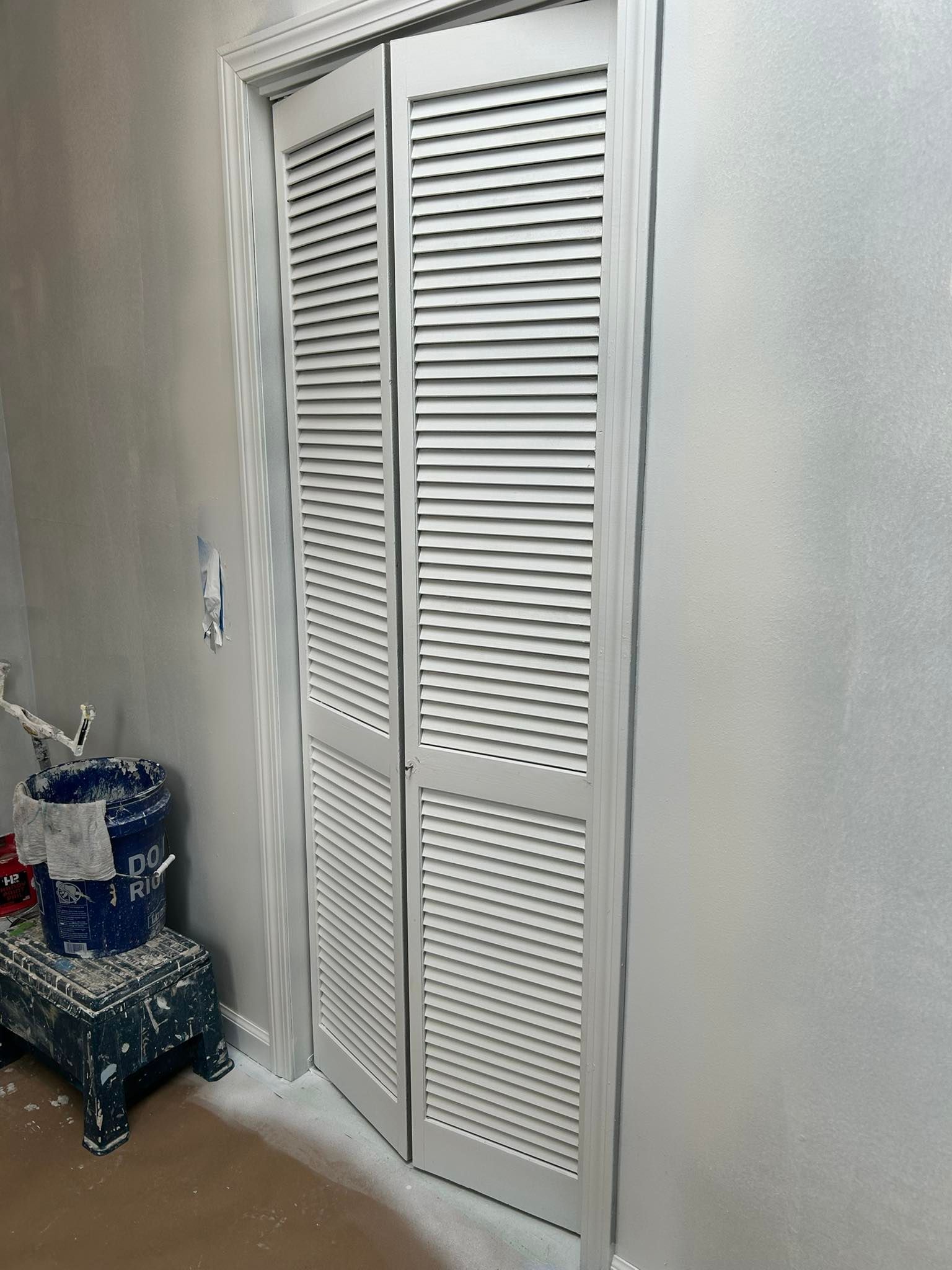 All trim, chair rails, baseboards, both sides of the entrance door, two closet doors, basement, bathroom and family room doors were all given two coats of the base white as well.