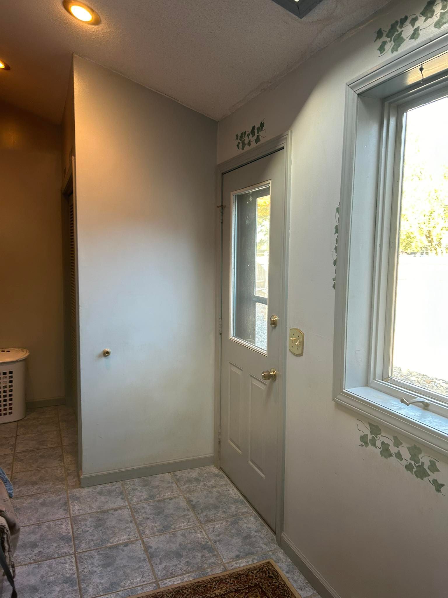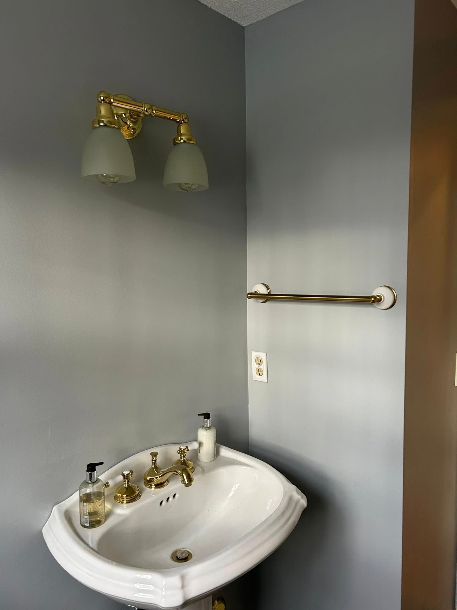 First, we repaired a dent in the wall above the sink by patching and sanding it 3x’s. Same went for the puppy scratches and chew marks at their entrance door and along various spots on the baseboard. An old landline phone jack was removed and replaced with a blank outlet cover.