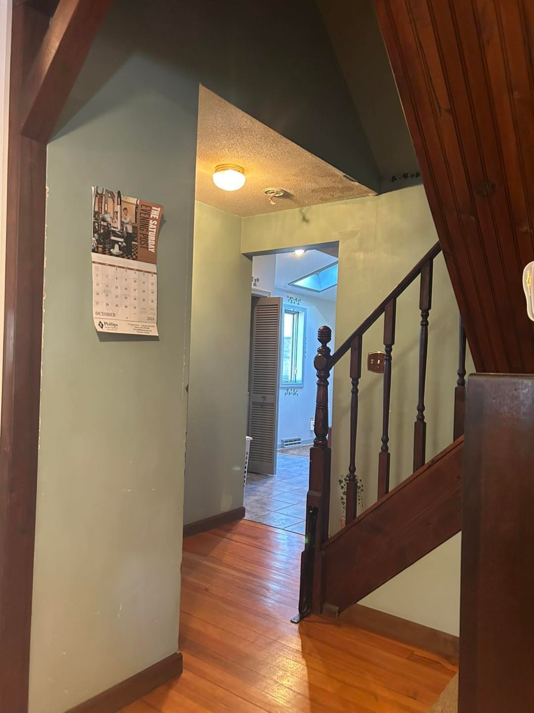 From there the stairwell and adjoining area to the kitchen were painted in the same color pattern. The small ceiling before the bath was replaced with new woodwork, which was primed (twice) to assure the wood knots wouldn’t bleed through with Bins primer. Then given two coats of ceiling paint.