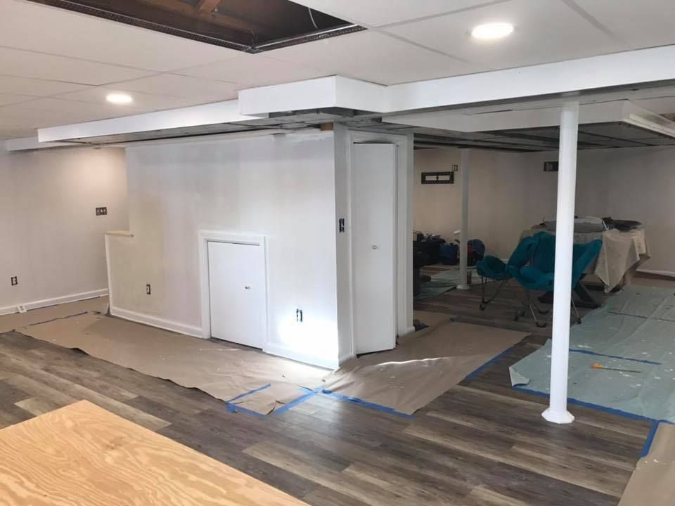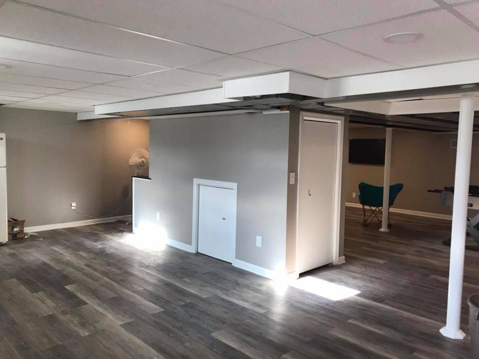 He wanted basement transformed from a shade of brown to Benjamin Moore’s Stonington Grey with an eggshell finish. Any dents and scratches were filled in, sanded and primed. Then we put up two coats of the Grey.
