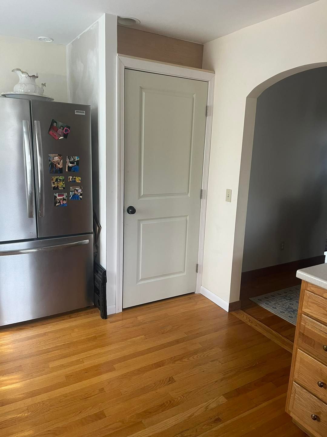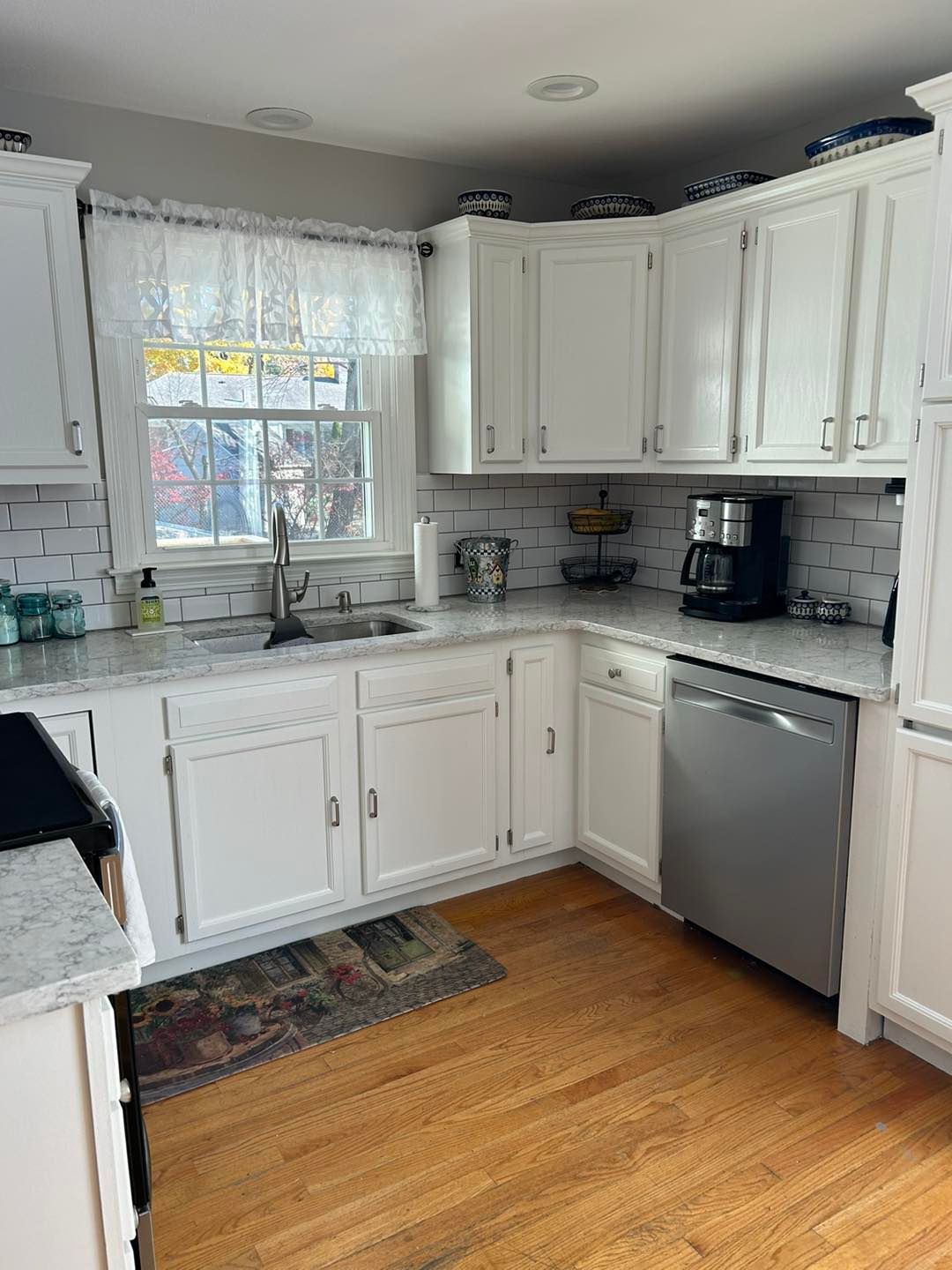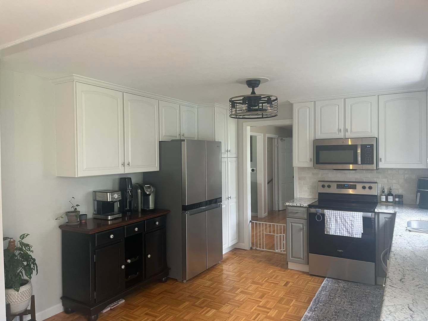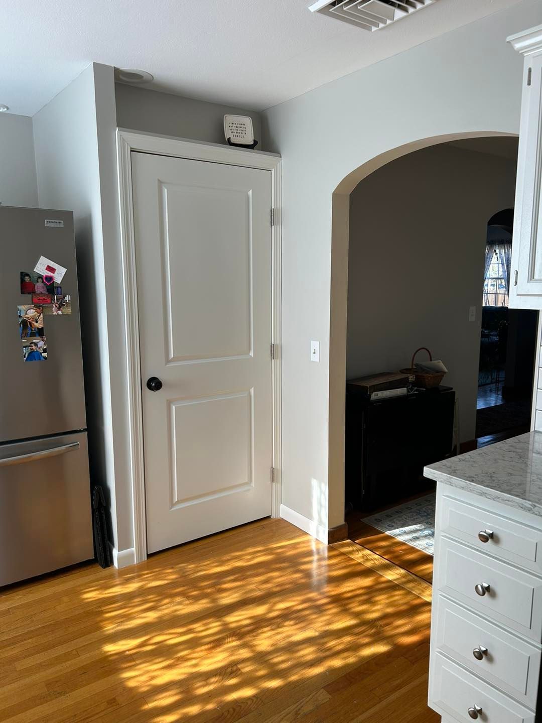 She needed her kitchen and hallway walls transformed from a shade of beige to Cloud White by Benjamin Moore. All walls were primed first and then hit with two coats of the Cloud White.