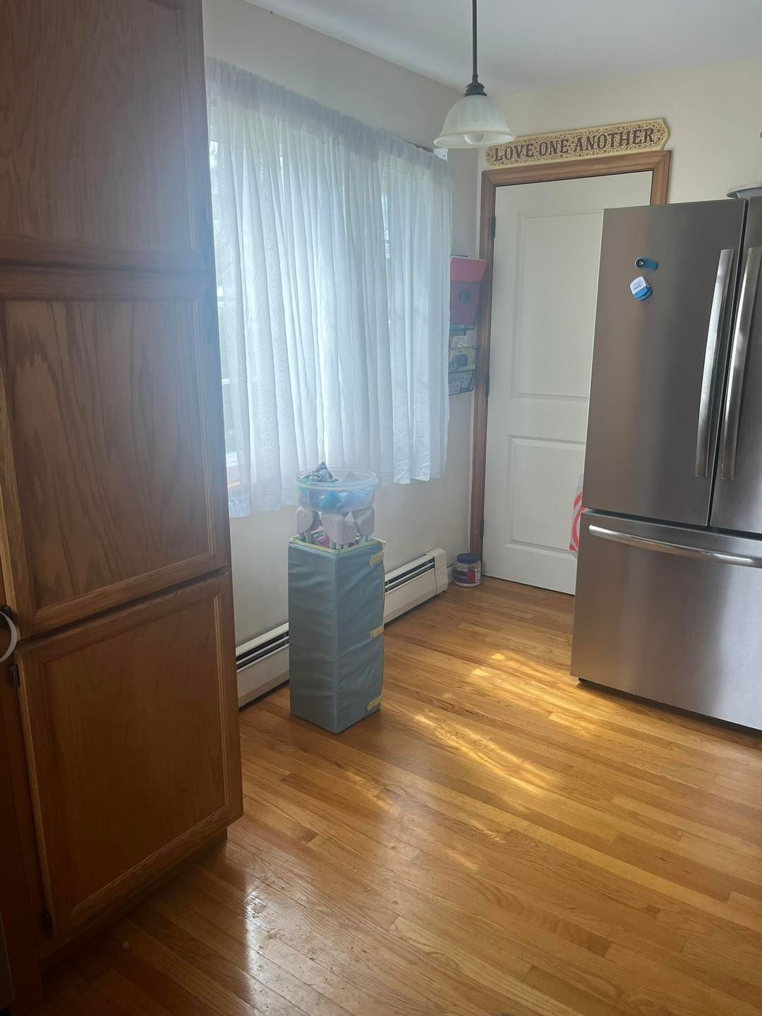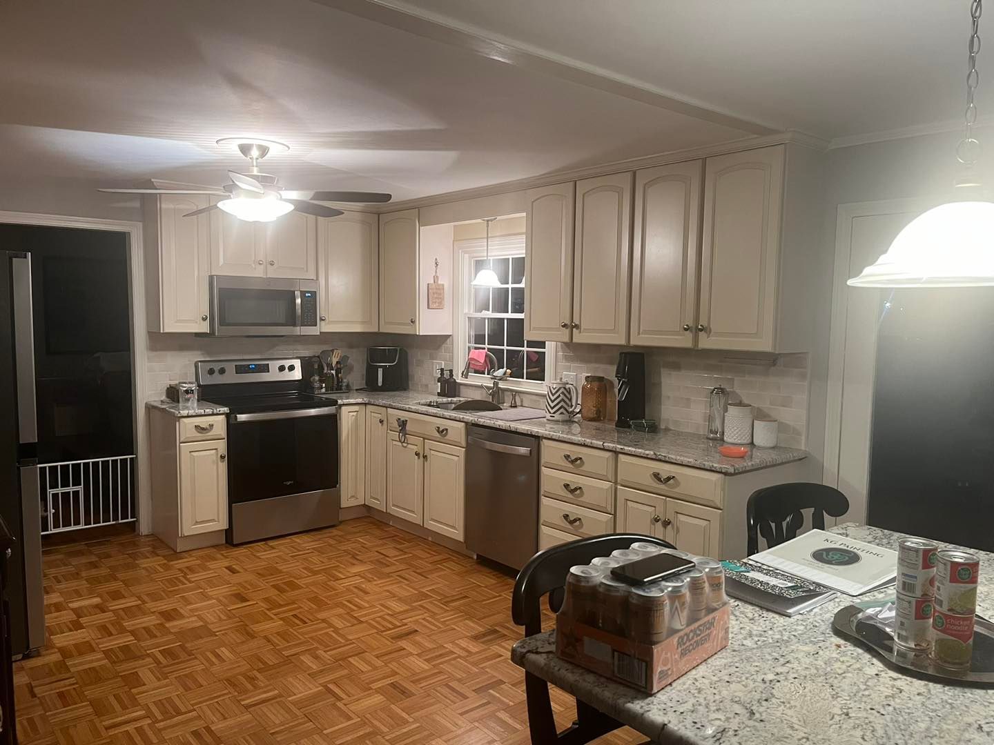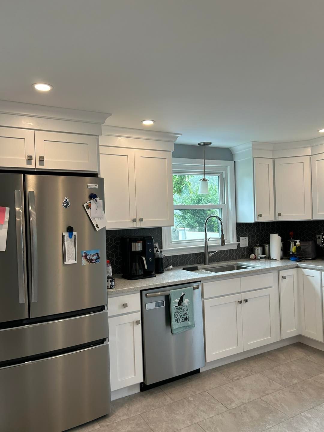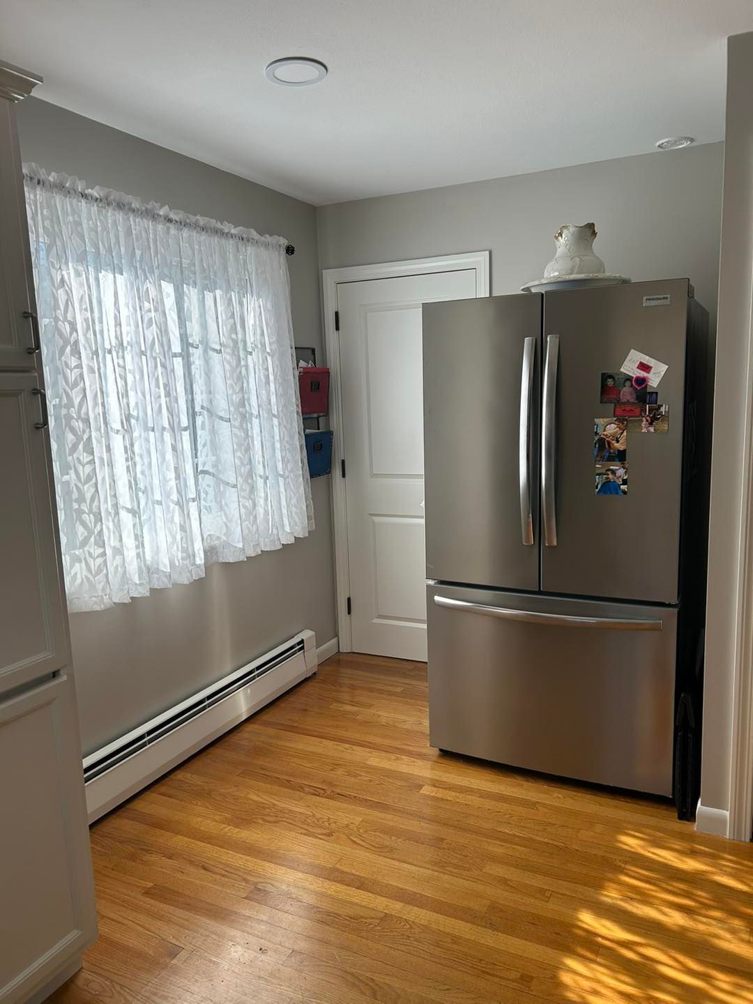 She needed her kitchen and hallway walls transformed from a shade of beige to Cloud White by Benjamin Moore. All walls were primed first and then hit with two coats of the Cloud White.