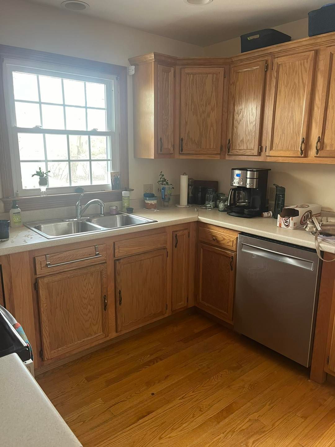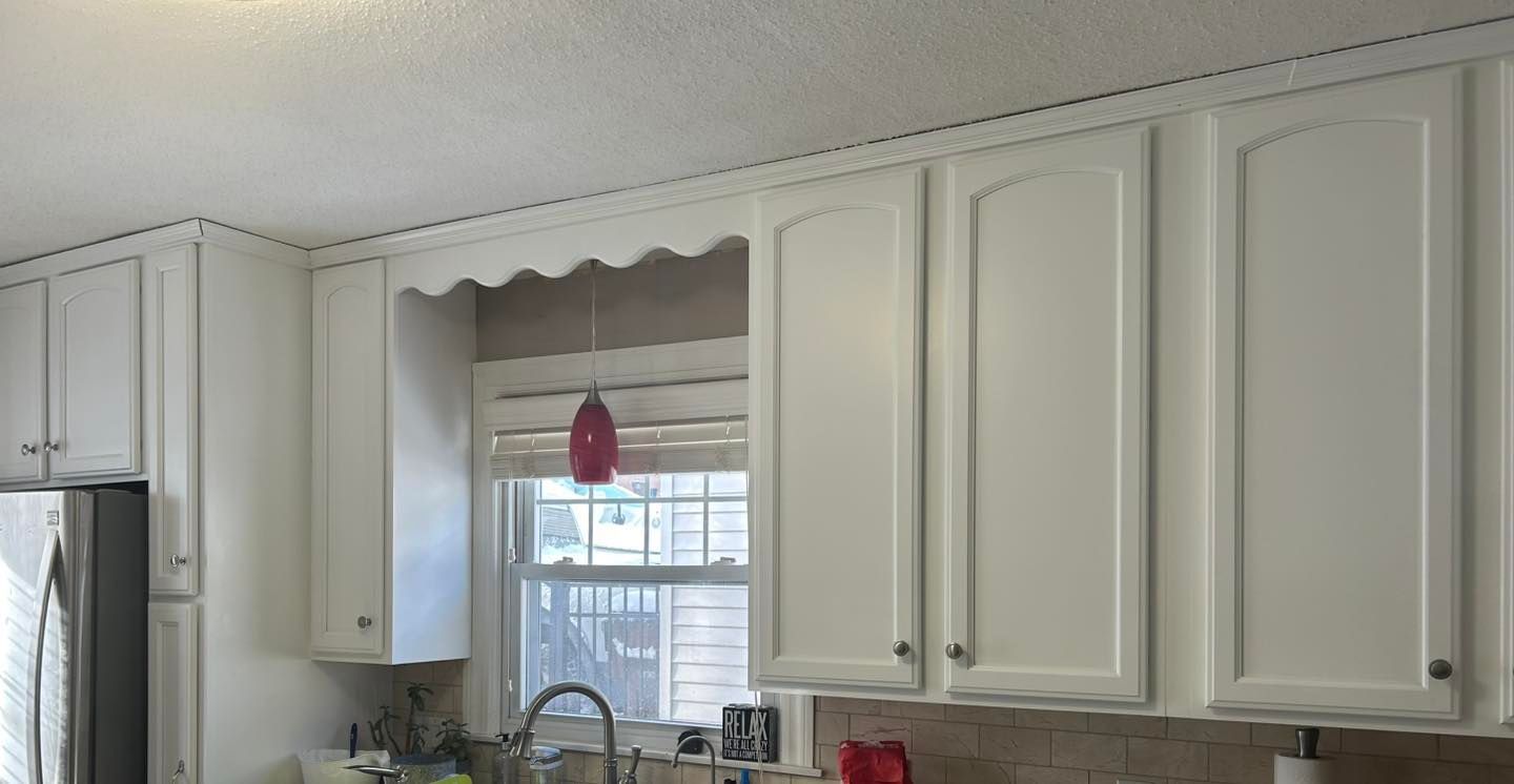 She wanted her kitchen cabinets transformed from the original color to Benjamin Moore Basic White with a semigloss finish.