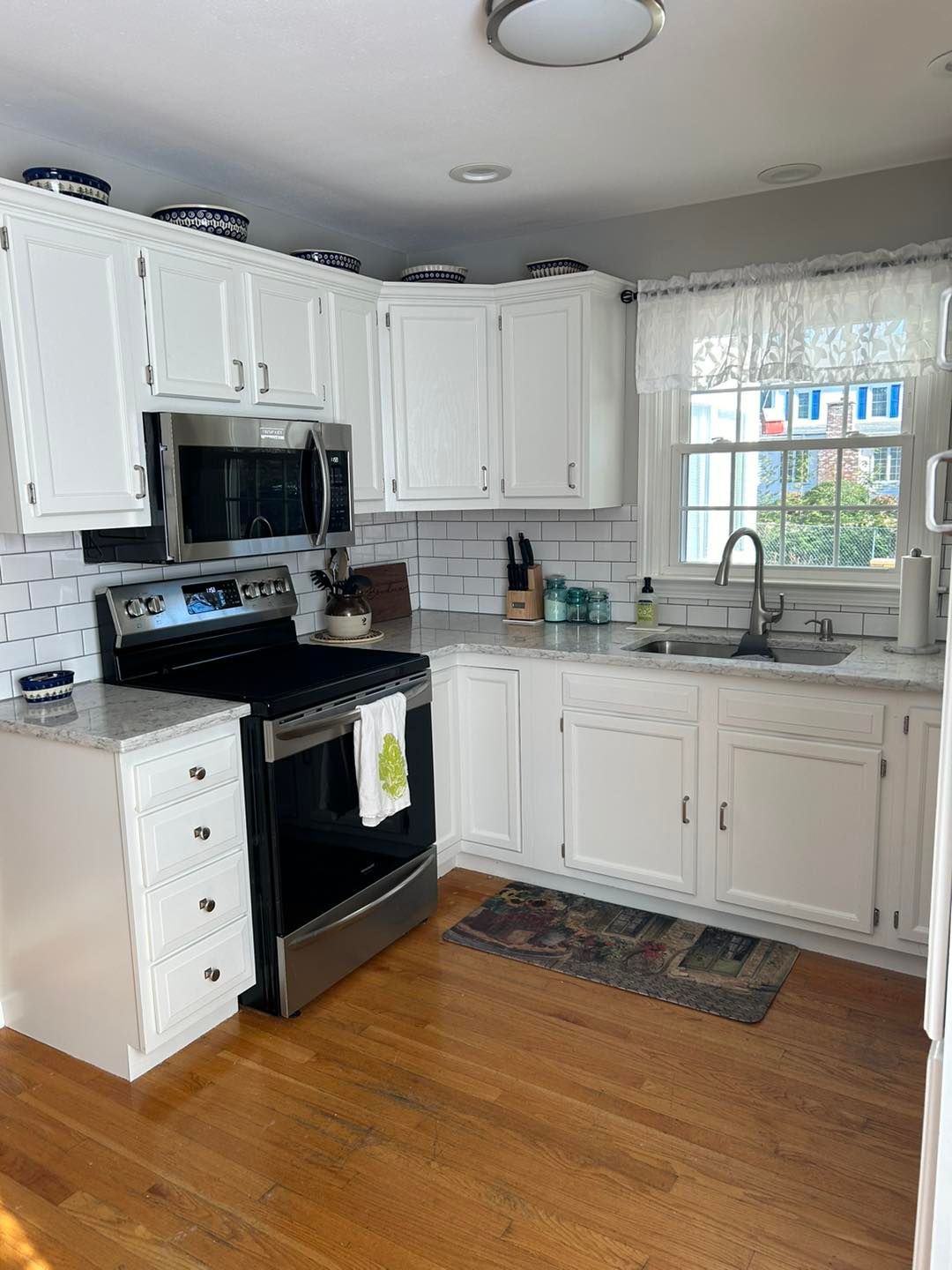 They wanted an upgrade for their kitchen cabinets. All doors, drawer faceplates and the cabinet frame were cleaned, sanded and primed. Next all were given two coats of Benjamin Moore’s White Wisp with a semigloss sheen.