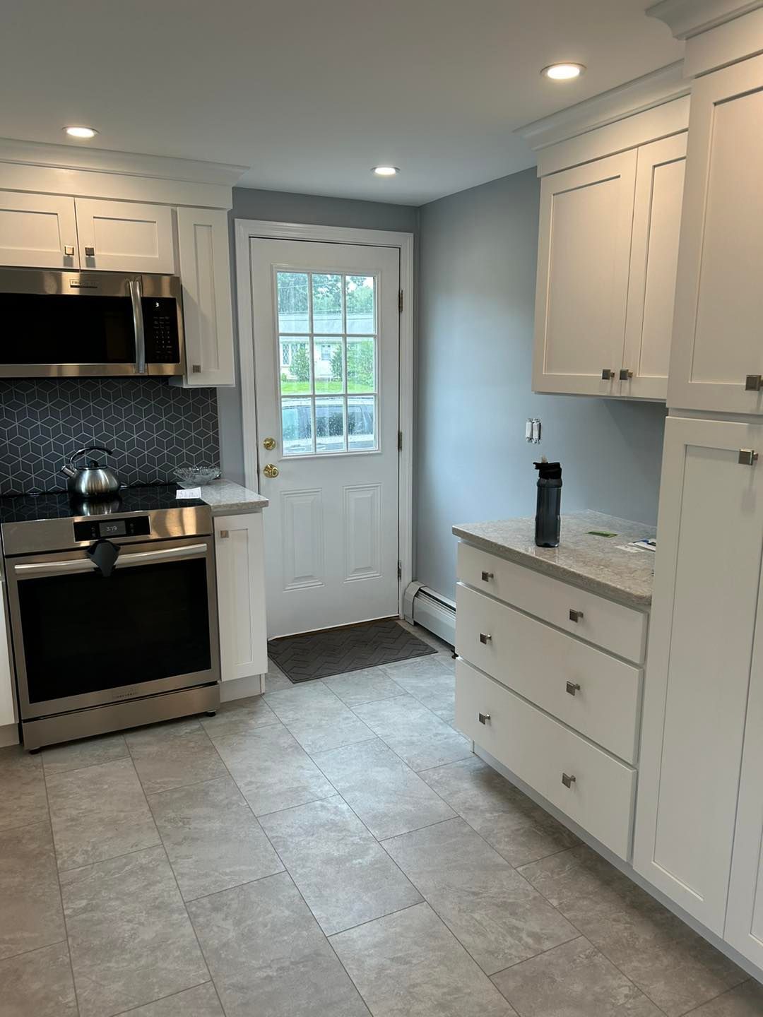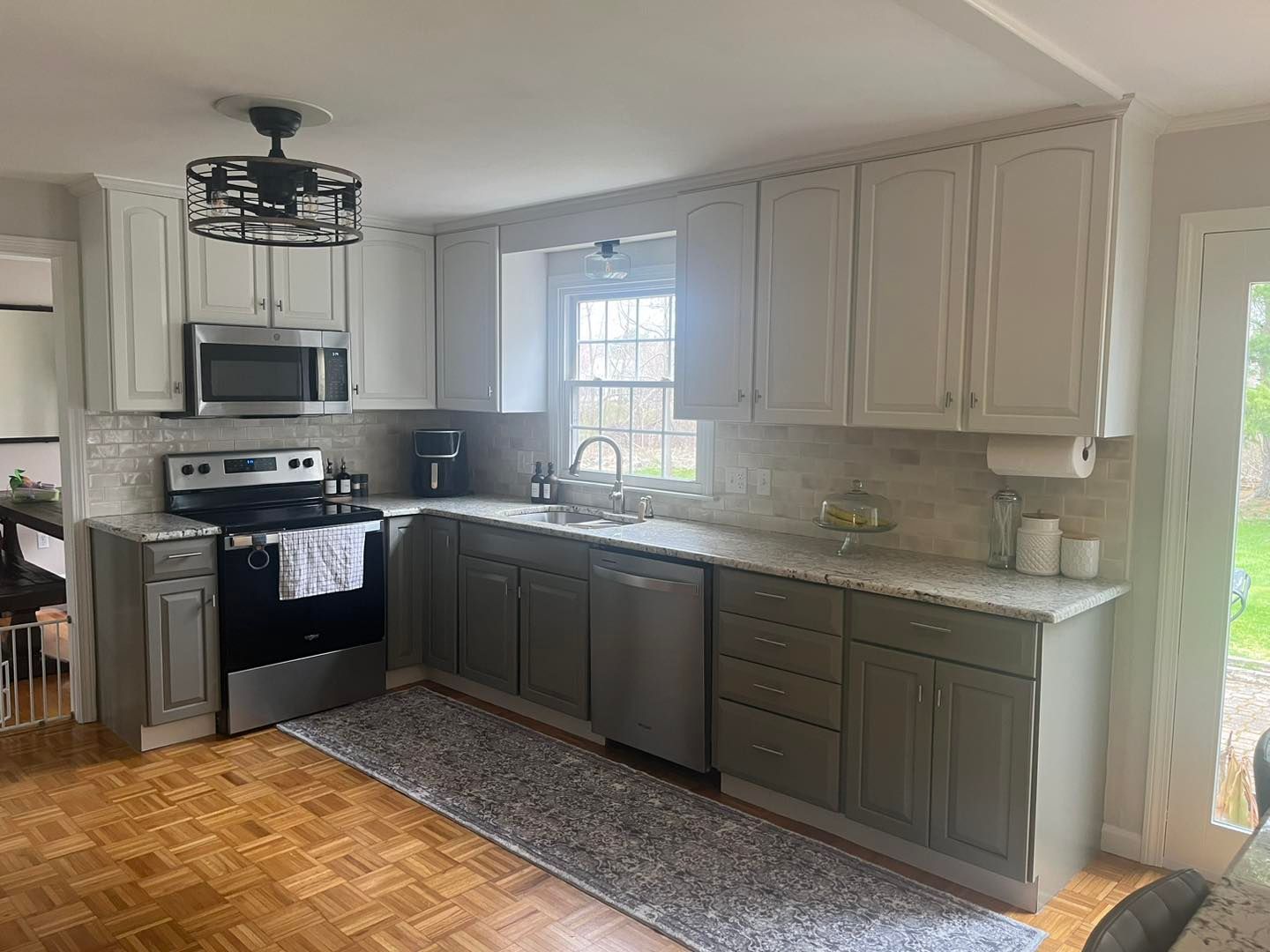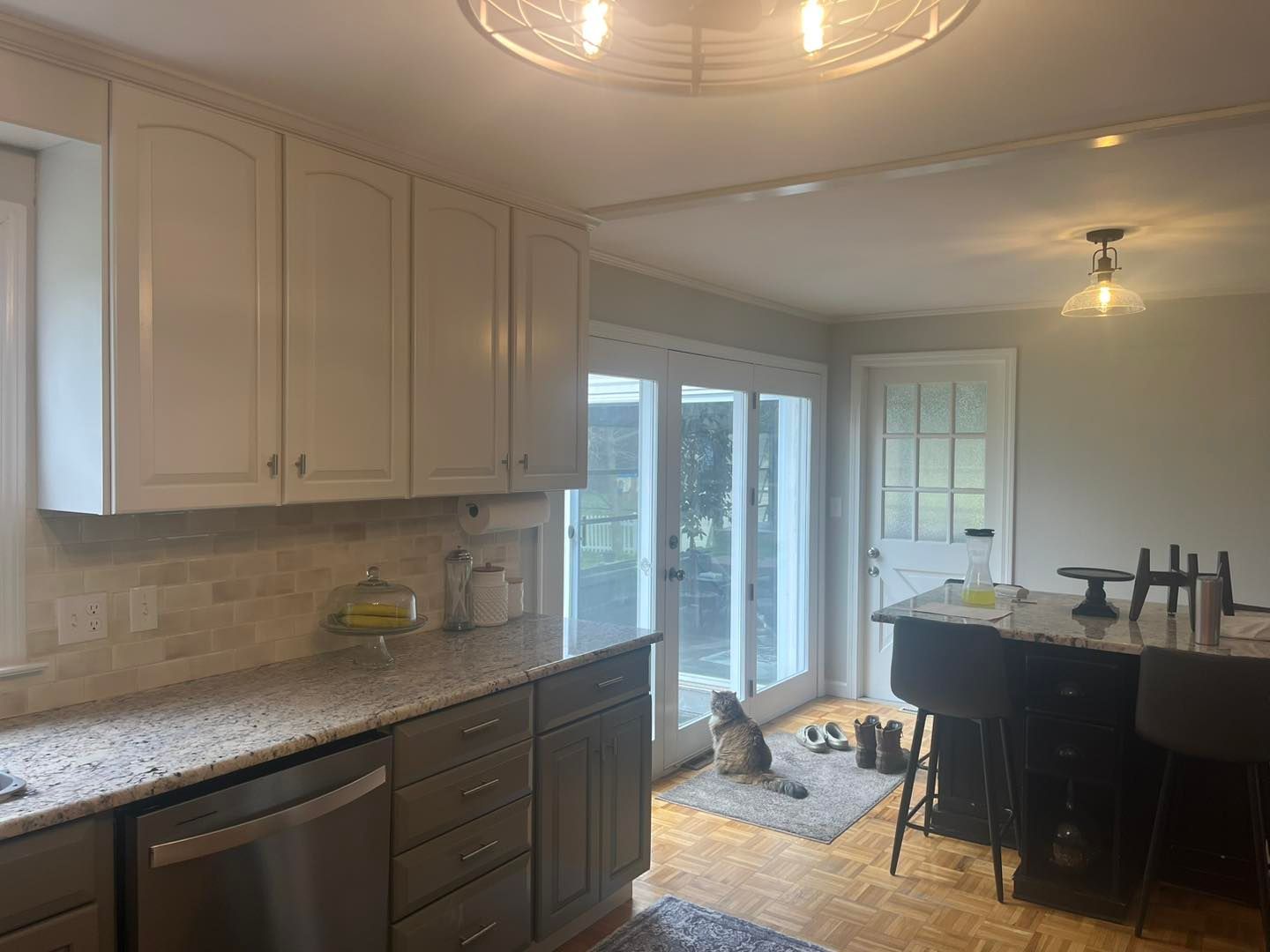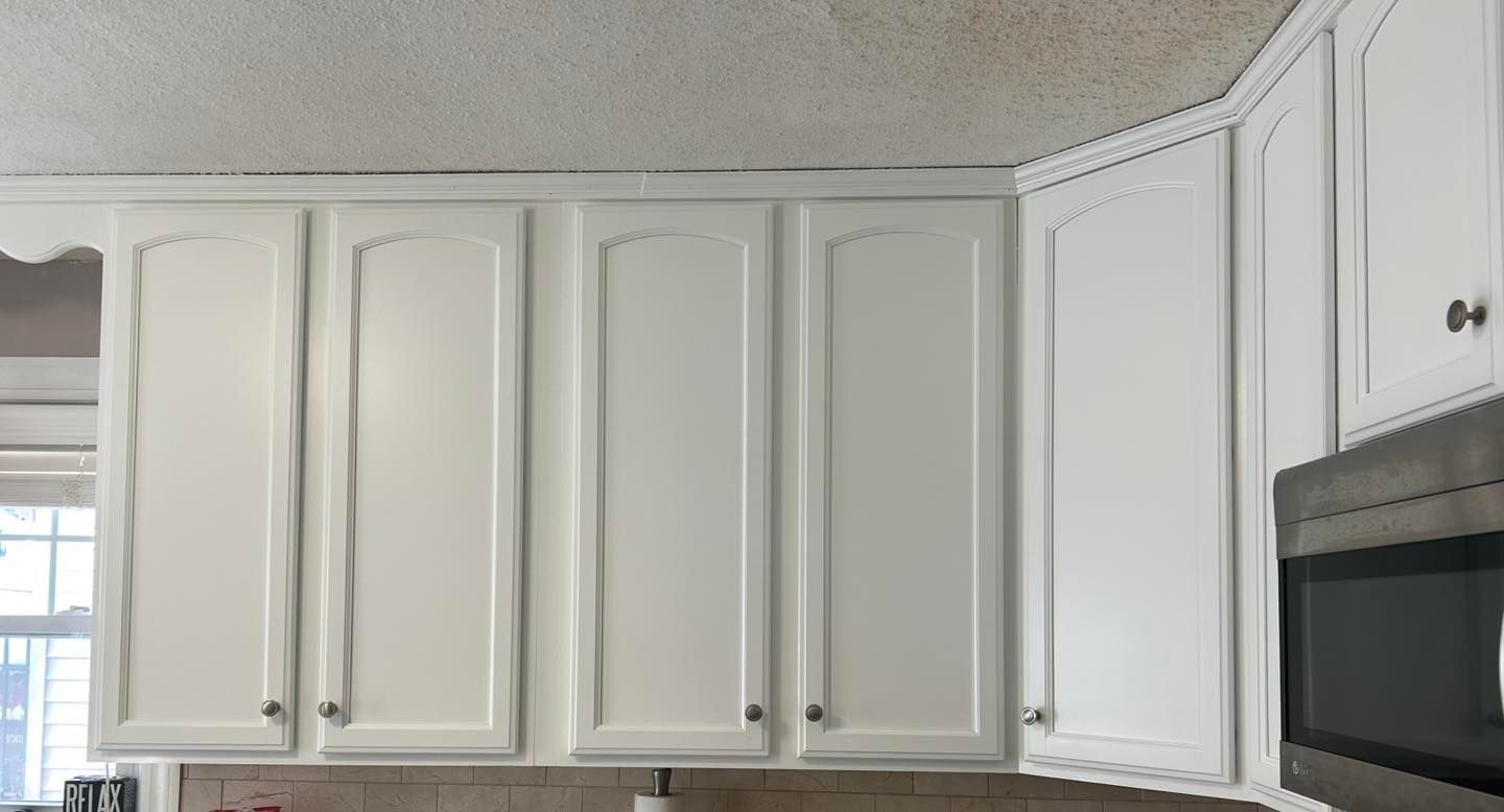 From there we moved on to the kitchen where the ceiling was also given two coats of waterborne. The cabinets were sanded, primed, sanded again and then given two coats of White Dove. The trim, baseboard and two doors were also painted with two coats of White Dove. Finally, the walls were given two coats of a color matched Repose Grey with a satin finish.