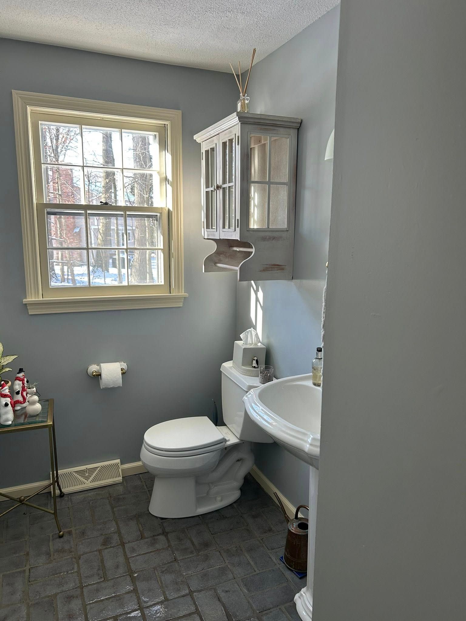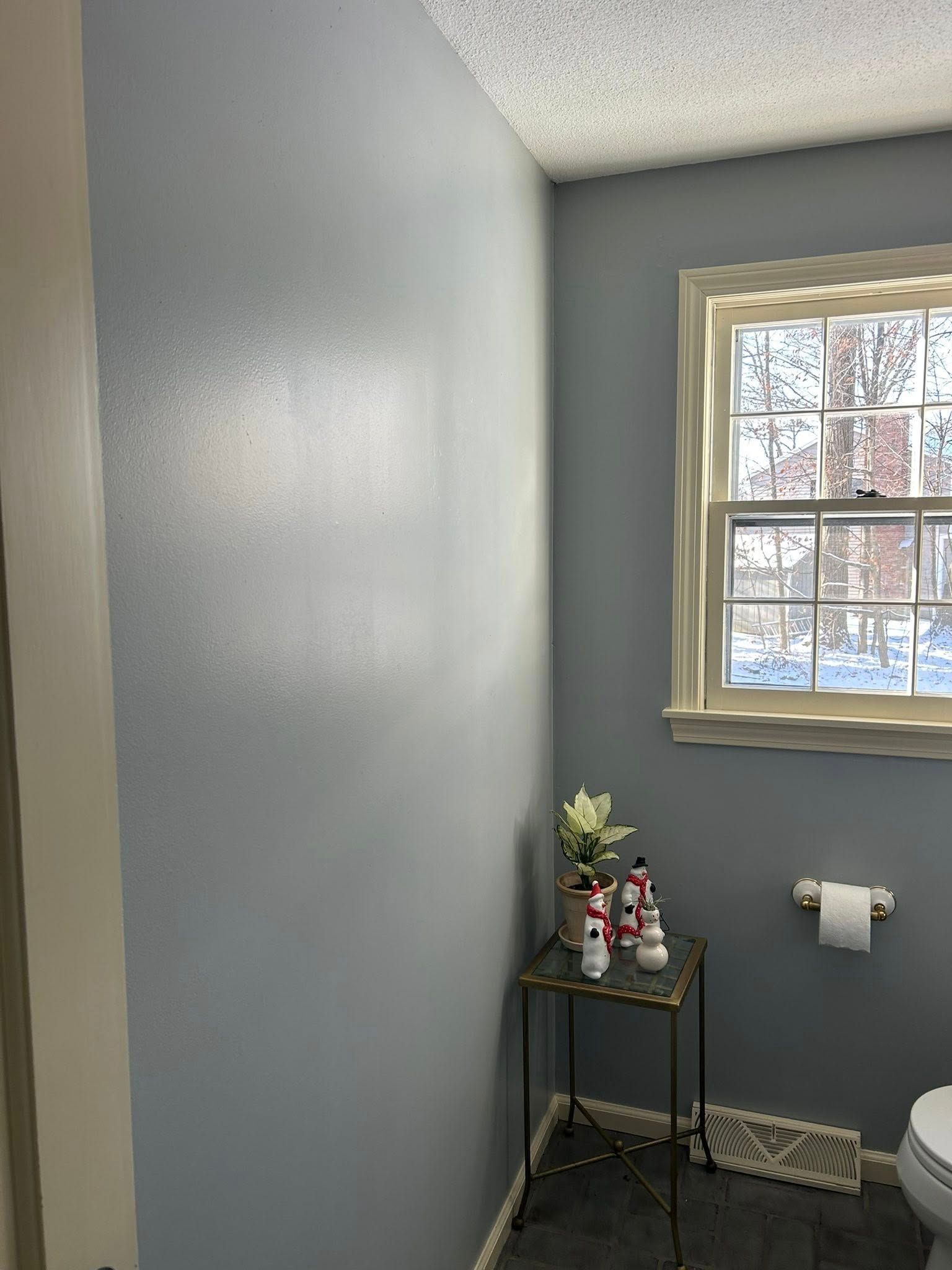 The ceiling was given two coats of Waterborne ceiling paint, and the walls had two coats of Winter Solstice with a satin finish applied.