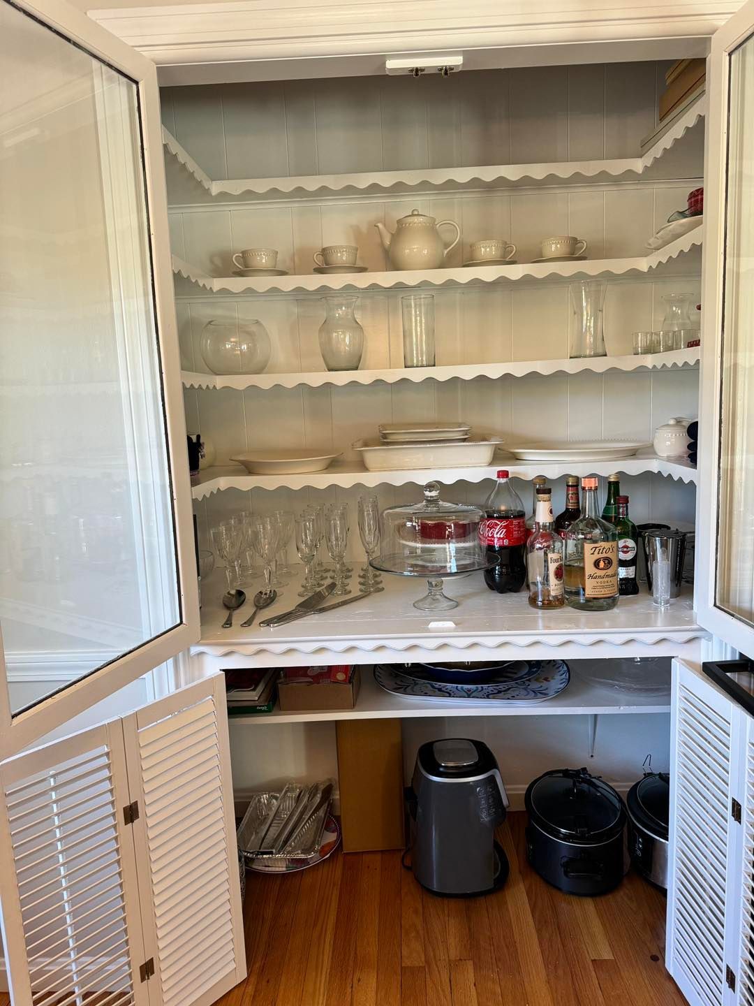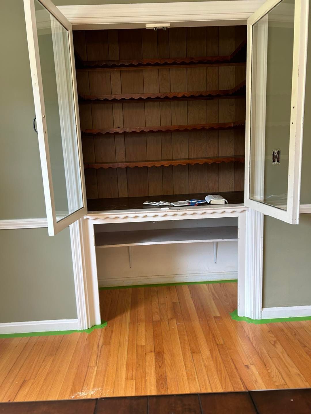 The interior of the hutch was lightly sanded and primed twice with Bins shellac-based primer to guarantee no color from the paneling bled through. Inside the hutch, hutch doors and cabinet doors were all given two coats of Ben Moore’s white base with a semigloss sheen.