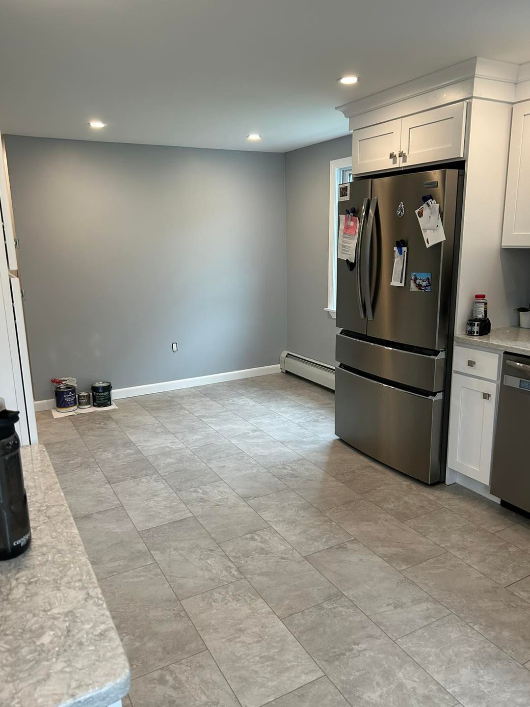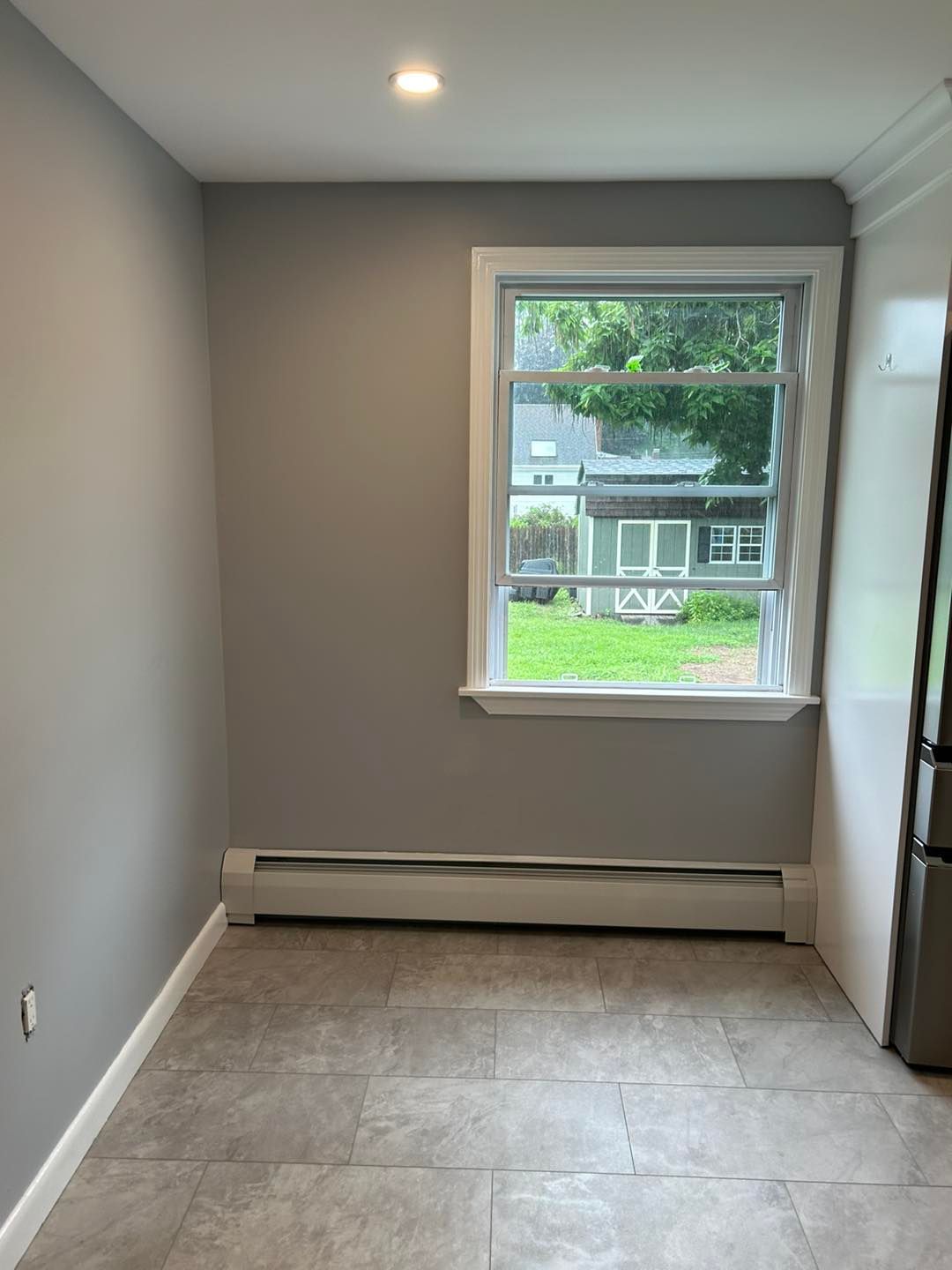 They recently had their basement finished. We primed the bare drywall and then put 2 coats of color matched Behr shade of grey.