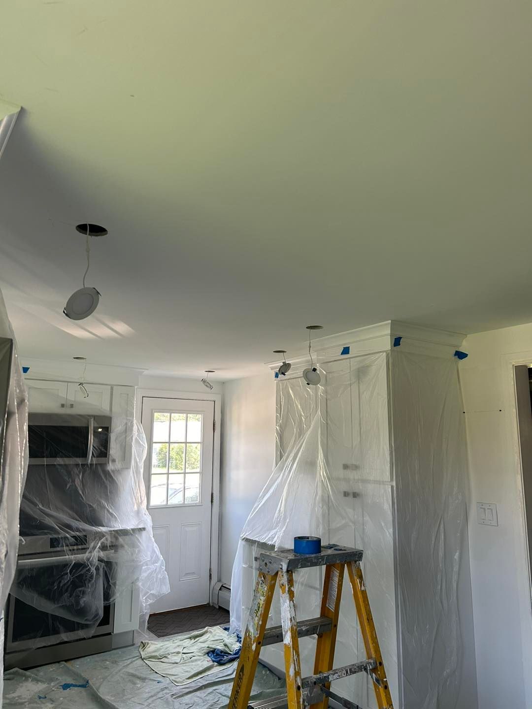 First plastic was hung to protect the appliances and cabinets from drips, as well as laying tarps over the newly installed floor. With everything covered we put up two coats of Ben Moore waterborne ceiling paint.